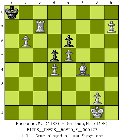 Last move : 1-0 2016 December 10 1:3:43 [Event "FICGS__CHESS__RAPID_E__000177"] [Site "FICGS"] [Date "2016.09.22"] [Round "1"] [White "Barradas,Anderson"] [Black "Salinas,Marcelo"] [Result "1-0"] [WhiteElo "1182"] [BlackElo "1175"] 1.e4 e6 2.d4 Qh4 3.Bd3 Nc6 4.Nf3 Qg4 5.O-O Nf6 6.h3 Qh5 7.c3 Qa5 8.b4 Qb6 9.a4 a5 10.Be3 d5 11.e5 Ne4 12.b5 Nd8 13.c4 c5 14.bxc6 Nxc6 15.c5 Qb2 16.Na3 Nc3 17.Qc2 Qxc2 18.Nxc2 Ne4 19.Bxe4 f5 20.Bd3 Nb4 21.Bb5+ Bd7 22.Bxd7+ Kxd7 23.Nxb4 axb4 24.Rfb1 b5 25.Rxb4 Ra5 26.Rxb5 Rxb5 27.axb5 h6 28.Ra7+ Kc8 29.b6 Kb8 30.Nh4 g5 31.Ng6 Rg8 32.Nxf8 Rxf8 33.f4 Rg8 34.c6 Rc8 35.c7+ Rxc7 36.Rxc7 Ka8 37.fxg5 hxg5 38.Bxg5 Kb8 39.h4 f4 40.Bxf4 Ka8 41.h5 Kb8 42.h6 Ka8 43.h7 1-0 French defense Kingside Castling by player White (move 5) Player White won this chess game. Follow this game move after move (download)Half the variations which are calculated in a tournament game turn out to be completely superfluous. Unfortunately, no one knows in advance which half. (Jan Tinman) Deine Wertungszahl - vorausgesetzt einige Jahre schachliche Anstrengung - entspricht etwa dem zehnfachen Deines IQ plus 1000. (Jonathan Levitt) La enorme capacidad mental, en la que sin ella no puede un jugador de Ajedrez existir, es demasiado requerida por el Ajedrez al grado de que nunca podrá liberar su mente de este juego. (Albert Einstein) Il n'y a pas de prix trop élevé au scalp de l'ennemi. (Koblentz) Everybody lies. (Gregory House, House M.D.)