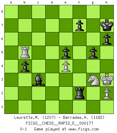 Last move : 0-1 2016 October 15 21:26:11 [Event "FICGS__CHESS__RAPID_E__000177"] [Site "FICGS"] [Date "2016.09.22"] [Round "1"] [White "Leurette,Marc-Antoine"] [Black "Barradas,Anderson"] [Result "0-1"] [WhiteElo "1207"] [BlackElo "1182"] 1.e4 e5 2.Nf3 Nc6 3.Bc4 Bc5 4.O-O Nf6 5.Nc3 O-O 6.d3 a6 7.Bg5 h6 8.Bxf6 Qxf6 9.a3 b5 10.Bd5 Bb7 11.b4 Bb6 12.Ne2 Rab8 13.c3 Ne7 14.Bxb7 Rxb7 15.d4 d6 16.dxe5 dxe5 17.a4 Ng6 18.axb5 axb5 19.Qd3 c6 20.Rad1 Rd8 21.Qc2 Rbd7 22.Rxd7 Rxd7 23.Ng3 Nh4 24.Nh5 Nxf3+ 25.gxf3 Qxf3 26.Ng3 Rd3 27.Qe2 Rxc3 28.Qxf3 Rxf3 29.Kg2 Rb3 30.Ra1 Rxb4 31.Ra6 Bd4 32.Rxc6 Rb2 33.Rc8+ Kh7 34.Rc7 Rxf2+ 35.Kh3 b4 36.Rb7 Bc3 37.Rb5 g5 0-1 Giuoco Piano Kingside Castling by player White (move 4) Kingside Castling by player Black (move 5) Player Black won this chess game. Follow this game move after move (download)Checkers is for tramps. (Paul Morphy) Man wirke der falschen Auffassung entgegen, als ob jeder Zug Unmittelbares zu leisten habe; auch Werte- und Ruhezüge haben ihre Existenzberechtigung. (Aaron Nimzowitsch) En el Ajedrez, cuando menos, el valiente hereda la tierra. (Edmar Mednis) Je ne crois pas en la psychologie, je crois aux bons coups. (Robert Fischer) First of all, we have to go back to the classical time control. (Anatoly Karpov)