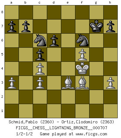 Last move : 1/2-1/2 2016 September 22 23:37:54 [Event "FICGS__CHESS__LIGHTNING_BRONZE__000707"] [Site "FICGS"] [Date "2016.09.22"] [Round "1"] [White "Schmid,Pablo"] [Black "Ortiz,Clodomiro"] [Result "1/2-1/2"] [WhiteElo "2360"] [BlackElo "2363"] 1.d4 Nf6 2.Bg5 Ne4 3.Bf4 c5 4.d5 Qb6 5.Bc1 e6 6.f3 Qa5+ 7.c3 Nf6 8.e4 d6 9.Bd2 Qd8 10.c4 Be7 11.Nc3 O-O 12.Bd3 exd5 13.exd5 Na6 14.Nge2 Nd7 15.f4 g6 16.O-O f5 17.Re1 Re8 18.Kh1 Nf6 19.Ng1 Ng4 20.Re2 Nb4 21.Bb1 Bf8 22.h3 Rxe2 23.Qxe2 Nf6 24.Nf3 Bd7 25.Ng5 Qb6 26.a3 Re8 27.Qf1 Na6 28.g4 Bg7 29.gxf5 gxf5 30.Ne6 Bxe6 31.dxe6 Nc7 32.Bxf5 Nxe6 33.Qg2 Nd4 34.Bd3 Qc6 35.Re1 Qxg2+ 36.Kxg2 Rxe1 37.Bxe1 Nh5 38.Bd2 Nb3 39.Be3 Bxc3 40.bxc3 Na5 41.Kf3 Nf6 42.f5 Nc6 43.Kf4 Kf7 44.Be2 Kg7 45.Bf3 Nd7 46.Bd5 Nf6 47.Bf3 Nd7 48.Bd5 Nf6 49.Bf3 1/2-1/2 Trompowsky attack (Ruth, Opovcensky Opening) Kingside Castling by player Black (move 11) Kingside Castling by player White (move 16) This chess game ended in a draw. Follow this game move after move (download)Chess is ruthless: you've got to be prepared to kill people. (Nigel Short) Kein Schachspieler kann gut schlafen. (H. G. Wells) Cada Peón es una Reina en potencia. (James Mason) Aux échecs, l'amour-propre est satisfait quand on remporte la victoire, mais il n'y a pas de honte à être battu. (Benjamin Franklin) A married woman is like a fish riding a bicycle. (Rodolfo d'Ettorre)