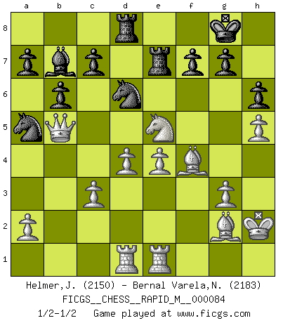 Last move : 1/2-1/2 2016 December 13 20:12:53 [Event "FICGS__CHESS__RAPID_M__000084"] [Site "FICGS"] [Date "2016.09.23"] [Round "1"] [White "Helmer,Janos"] [Black "Bernal Varela,Nelson"] [Result "1/2-1/2"] [WhiteElo "2150"] [BlackElo "2183"] 1.Nf3 Nf6 2.c4 e6 3.d4 b6 4.g3 Bb7 5.Bg2 Be7 6.O-O O-O 7.Re1 d5 8.cxd5 exd5 9.Nc3 Ne4 10.Bf4 Nc6 11.h4 h6 12.Qc2 Bb4 13.Red1 Bxc3 14.bxc3 Na5 15.Ne5 Nd6 16.Re1 Re8 17.Rad1 Qc8 18.Kh2 Qd8 19.f3 Re7 20.e4 dxe4 21.fxe4 Qe8 22.h5 Rd8 23.Qe2 Qb5 24.Qxb5 1/2-1/2 Reti Opening Kingside Castling by player White (move 6) Kingside Castling by player Black (move 6) This chess game ended in a draw. Follow this game move after move (download)Everything is in a state of flux, and this includes the world of Chess. (Mikhail Botvinnik) Ich spiele 70 Eröffnungssysteme. (Viktor Kortschnoi) Robert Fischer es la ley hacia si mismo. (Larry Evans) Dieu déplace le joueur, et celui-ci la pièce. Quel Dieu derrière Dieu commence donc la trame ? Arturo Perez-Reverte (prix de littérature policière 1993). Perhaps chess is the wrong game for the times (The Chess Master and the Computer, by Garry Kasparov - 2010)