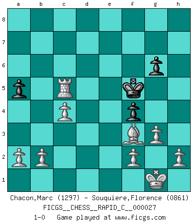 Last move : 1-0 2007 April 15 18:56:15 [Event "FICGS__CHESS__RAPID_C__000027"] [Site "FICGS"] [Date "2007.03.27"] [Round "1"] [White "Chacon,Marc"] [Black "Souquiere,Florence"] [Result "1-0"] [WhiteElo "1297"] [BlackElo "0861"] 1.d4 d5 2.c4 e6 3.Nf3 Nc6 4.Bd2 Be7 5.Nc3 Nf6 6.e3 b6 7.Bd3 g6 8.Qa4 Bb7 9.Ne5 Qd6 10.e4 O-O 11.Nxc6 Bxc6 12.e5 Qd8 13.Qxc6 Rb8 14.exf6 Bxf6 15.Be3 e5 16.Nxd5 Bh4 17.dxe5 Re8 18.Nf6+ Kg7 19.Nxe8+ Qxe8 20.Bd4 Qxc6 21.e6 f6 22.O-O Re8 23.g3 Bg5 24.Rfe1 Rxe6 25.Rxe6 Qxe6 26.Rd1 c6 27.Bc3 c5 28.Re1 Qd6 29.Be2 a5 30.Bf3 Bd2 31.Rd1 h6 32.Bxd2 f5 33.Bxh6+ Kxh6 34.Rxd6 Kg5 35.Rxb6 f4 36.Rb5 Kf5 37.Rxc5+ 1-0 Queen's gambit declined Kingside Castling by player Black (move 10) Kingside Castling by player White (move 22) Player White won this chess game. Follow this game move after move (download)When you see a good move, look for a better one. (Emanuel Lasker) Du musst Deinen Gegner in einen tiefen dunklen Wald führen wo 2+2=5 ist und wo der Weg, der wieder hinausführt, nur breit genug für einen ist. (Mikhail Nekhemyevich Tal) Sin errores no puede haber brillantez. (Emanuel Lasker) On est toujours la mazette de quelqu'un d'autre. (Anonyme) A good book on your shelf is a friend that turns its back on you and remains a friend. (Author unknown)