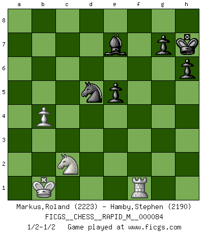 Last move : 1/2-1/2 2017 February 6 10:56:44 [Event "FICGS__CHESS__RAPID_M__000084"] [Site "FICGS"] [Date "2016.09.23"] [Round "1"] [White "Markus,Roland"] [Black "Hamby,Stephen"] [Result "1/2-1/2"] [WhiteElo "2223"] [BlackElo "2190"] 1.e4 c5 2.Nf3 d6 3.d4 cxd4 4.Nxd4 Nf6 5.Nc3 a6 6.Be3 e5 7.Nb3 Be6 8.f3 Be7 9.Qd2 O-O 10.O-O-O Nbd7 11.g4 b5 12.g5 b4 13.Ne2 Ne8 14.f4 a5 15.f5 a4 16.Nbd4 exd4 17.Nxd4 b3 18.Kb1 bxc2+ 19.Nxc2 Bb3 20.axb3 axb3 21.Na3 Ne5 22.h4 Ra4 23.Bd4 Qa8 24.Qe3 Kh8 25.Bb5 Ra5 26.Bc3 Rxb5 27.Nxb5 Qa2+ 28.Kc1 Nc4 29.Qd3 Qa1+ 30.Qb1 Qa4 31.Na3 Ne5 32.Rh3 Qc6 33.Kd2 f6 34.Bxe5 dxe5 35.Rxb3 fxg5 36.Qc2 Qa8 37.h5 Nf6 38.Kc1 Rc8 39.Rc3 Rxc3 40.Qxc3 Qxe4 41.Nc2 Qf4+ 42.Kb1 g4 43.Re1 g3 44.Rg1 Qxf5 45.Qxg3 Nxh5 46.Qg2 h6 47.Re1 Nf6 48.Qf1 Qxf1 49.Rxf1 Kh7 50.b4 Nd5 1/2-1/2 Sicilian : Najdorf, Byrne (English) attack Kingside Castling by player Black (move 9) Queenside Castling by player White (move 10) 10 pieces endgame at move 49 : White KRNP , Black KBNPPP WHITE : King + 1 Rook 1 Knight 1 Pawn BLACK : King + 1 Bishop 1 Knight 3 Pawns This chess game ended in a draw. Follow this game move after move (download)When I have White, I win because I am white; When I have Black, I win because I am Bogolyubov. (Bogolyubov) Die Auseinandersetzung mit Karpow war politisch geprägt. Er stand für das kommunistische System, wurde von dessen Repräsentanten gehätschelt. Ich war der Oppositionelle. Jeder Schachweltmeister spiegelt auch die gesellschaftlichen Verhältnisse wider. Kramnik steht für die Börsen-Generation des Neuen Markts, ideologiefrei, zahlenfixiert. (Garry Kasparov) El Ajedrez es parte de la cultura, y si una cultura esta en decadencia, entonces también el Ajedrez declinará. (Mikhail Botvinnik) Les Echecs sont affaire de jugement sensible. Savoir quand frapper et quand esquiver. (Fischer) Question: Is 'This statement is paradoxical' a paradoxical statement ? Or is it a meta-paradox ? (Normajean Yates)