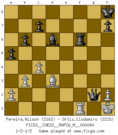 Last move : 1/2-1/2 2016 October 30 19:17:46 [Event "FICGS__CHESS__RAPID_M__000084"] [Site "FICGS"] [Date "2016.09.23"] [Round "1"] [White "Pereira,Nilson"] [Black "Ortiz,Clodomiro"] [Result "1/2-1/2"] [WhiteElo "2162"] [BlackElo "2215"] 1.e4 g6 2.d4 Bg7 3.Nc3 d6 4.Nf3 Nf6 5.Be2 O-O 6.O-O e6 7.e5 dxe5 8.Nxe5 Nd5 9.Ne4 Nd7 10.f4 b6 11.Bf3 Bb7 12.c4 Ne7 13.Be3 Rb8 14.Bf2 Nf5 15.Re1 Qe7 16.Qa4 Nxe5 17.dxe5 Nh4 18.Bxh4 Qxh4 19.g3 Qe7 20.Rad1 Rbd8 21.Qc2 Rxd1 22.Rxd1 Bxe4 23.Bxe4 g5 24.Kh1 gxf4 25.gxf4 Qh4 26.Rf1 f6 27.exf6 Rxf6 28.f5 Kh8 29.Qe2 Bf8 30.b3 Bd6 31.Bd3 exf5 32.Bxf5 Qh6 33.Qb2 Qg7 34.Qg2 a5 35.Bd3 Qxg2+ 1/2-1/2 Robatsch defense : Two knights variation Kingside Castling by player Black (move 5) Kingside Castling by player White (move 6) This chess game ended in a draw. Follow this game move after move (download)When in doubt... play Chess ! (Tevis) Zu meiner Zeit war ein 20 jähriger ein junger Spieler, heute ist er ein Veteran. (Garry Kasparov) Aquel que ve no otra dirección en el juego que la de dar Jaque Mate a su oponente, nunca será un buen jugador de Ajedrez. (Euwe) On croit qu'il y a plus de mauvais joueurs que de bons joueurs, c'est faux : Il y a autant de joueurs qui gagnent que de joueurs qui perdent. (Philippe Geluck) Pretend inferiority and encourage his arrogance. (Sun Tzu)