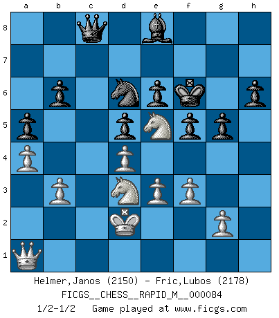 Last move : 1/2-1/2 2017 February 21 2:1:26 [Event "FICGS__CHESS__RAPID_M__000084"] [Site "FICGS"] [Date "2016.09.23"] [Round "1"] [White "Helmer,Janos"] [Black "Fric,Lubos"] [Result "1/2-1/2"] [WhiteElo "2150"] [BlackElo "2178"] 1.Nf3 Nf6 2.c4 g6 3.Nc3 Bg7 4.d4 d5 5.Bf4 O-O 6.Rc1 dxc4 7.e3 Be6 8.Ng5 Bg4 9.f3 Bc8 10.Bxc4 c6 11.Qb3 e6 12.Nge4 Nd5 13.Bxd5 cxd5 14.Nd6 Nc6 15.h4 Na5 16.Qb5 Bd7 17.Qd3 Qb6 18.b3 Bf6 19.h5 g5 20.Be5 Bd8 21.O-O f6 22.Bg3 f5 23.Be5 Be7 24.Ndb5 Rac8 25.Bc7 Rxc7 26.Nxc7 Ba3 27.N7b5 Bxc1 28.Rxc1 Be8 29.Na3 Qd8 30.Nc2 Bxh5 31.Qd2 Nc6 32.Ne1 Be8 33.Nd3 Rf7 34.Nd1 Rc7 35.N1f2 Kg7 36.Qc3 Rc8 37.Ne5 Ne7 38.Qd2 b6 39.a4 Rxc1+ 40.Qxc1 a5 41.Nfd3 Nc8 42.Kf2 h6 43.Ke2 Nd6 44.Kd2 Qc8 45.Qb2 Kf6 46.Qa1 1/2-1/2 Reti Opening Kingside Castling by player Black (move 5) Kingside Castling by player White (move 21) This chess game ended in a draw. Follow this game move after move (download)I have added these principles to the law: get the Knights into action before both Bishops are developed. (Emanuel Lasker) Schach ist ein Reich, wo sich die menschliche Phantasie frei entfalten kann. (David Bronstein) El Ajedrez lo es todo: arte, ciencia y deporte. (Anatoly Karpov) Les échecs sont un jeu terrible. Si vous n'avez pas le centre, votre adversaire a une position plus libre. Par contre, si vous avez le centre, alors vous avez vraiment quelque chose pour laquelle vous inquiéter ! (Siegbert Tarrasch) Without enthusiasm, virtue functions not at all, and vice only poorly. (Mignon McLaughlin, The Neurotic's Notebook, 1960)
