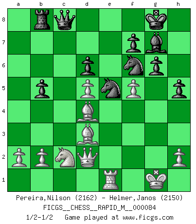 Last move : 1/2-1/2 2016 December 16 15:55:25 [Event "FICGS__CHESS__RAPID_M__000084"] [Site "FICGS"] [Date "2016.09.23"] [Round "1"] [White "Pereira,Nilson"] [Black "Helmer,Janos"] [Result "1/2-1/2"] [WhiteElo "2162"] [BlackElo "2150"] 1.e4 c5 2.Nf3 d6 3.d4 cxd4 4.Nxd4 Nf6 5.Nc3 a6 6.Be3 e5 7.Nb3 Be6 8.f3 h5 9.Qd2 Nbd7 10.Nd5 Bxd5 11.exd5 g6 12.Be2 Bg7 13.O-O b6 14.c4 O-O 15.Rae1 Rb8 16.Na1 e4 17.Nc2 exf3 18.gxf3 Ne5 19.Bd4 Re8 20.f4 Ned7 21.Bd3 b5 22.cxb5 axb5 23.Rxe8+ Qxe8 24.Re1 Qc8 25.f5 Ne5 1/2-1/2 Sicilian : Najdorf, Byrne (English) attack Kingside Castling by player White (move 13) Kingside Castling by player Black (move 14) This chess game ended in a draw. Follow this game move after move (download)We must make sure that Chess will not be like a dead language, very interesting, but for a very small group. (Sytze Faber) Eine Person mit durchschnittlichem IQ kann etwa eine ELO von 2000 erreichen. (Jonathan Levitt) Siempre es mejor sacrificar los hombres de tu oponente. (Savielly Tartakower) Le plus grand jeu de l'esprit jamais inventé, plus vous l'apprenez, plus vous y prenez du plaisir. (Garry Kasparov) It is the aim of the modern school, not to treat every position according to one general law, but according to the principle inherent in the position. (Richard Reti)