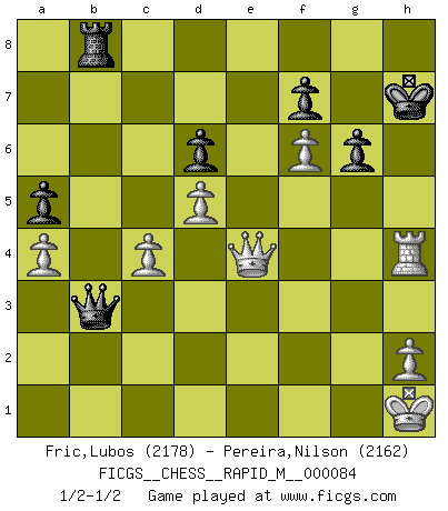Last move : 1/2-1/2 2017 January 9 9:16:39 [Event "FICGS__CHESS__RAPID_M__000084"] [Site "FICGS"] [Date "2016.09.23"] [Round "1"] [White "Fric,Lubos"] [Black "Pereira,Nilson"] [Result "1/2-1/2"] [WhiteElo "2178"] [BlackElo "2162"] 1.e4 c5 2.Nf3 d6 3.d4 cxd4 4.Nxd4 Nf6 5.Nc3 a6 6.Be3 e5 7.Nb3 Be6 8.f3 h5 9.Qd2 Nbd7 10.Nd5 Bxd5 11.exd5 g6 12.Be2 Bg7 13.O-O b6 14.c4 O-O 15.Kh1 Re8 16.g4 hxg4 17.fxg4 a5 18.a4 Ne4 19.Qe1 Ndc5 20.Nxc5 Nxc5 21.g5 e4 22.Qh4 Qe7 23.Ra2 Qe5 24.Bd1 Rf8 25.Qg3 Rae8 26.Qg2 Rd8 27.b3 Qc3 28.Re2 Nxb3 29.Bxb6 Nd4 30.Bxd8 Nxe2 31.Bf6 Nd4 32.Qxe4 Rb8 33.Rf4 Bxf6 34.gxf6 Nb3 35.Bxb3 Qxb3 36.Rg4 Kh7 37.Rh4+ 1/2-1/2 Sicilian : Najdorf, Byrne (English) attack Kingside Castling by player White (move 13) Kingside Castling by player Black (move 14) This chess game ended in a draw. Follow this game move after move (download)Bobby Fischer's current state of mind is indeed a tragedy. One of the world's greatest Chess players - the pride and sorrow of American Chess. (Frank Brady) Man gibt nur Pakete auf. (Paul Keres) Aquellos que dicen entender al Ajedrez, no entienden nada. (Robert Hubner) Si je n'étais pas joueur d'échecs, je serais le meilleur dans quelque chose d'autre. (Anatoli Karpov) The message for business people contemplating their place in the cyberspace is simple and direct: get linked or get lost. (Vic Sussman and Kenan Pollack)