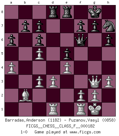 Last move : 1-0 2016 December 18 20:56:31 [Event "FICGS__CHESS__CLASS_F__000182"] [Site "FICGS"] [Date "2016.09.25"] [Round "1"] [White "Barradas,Anderson"] [Black "Puzanov,Vasyl"] [Result "1-0"] [WhiteElo "1182"] [BlackElo "0858"] 1.e4 e5 2.Nf3 Nc6 3.Bb5 a6 4.Bxc6 dxc6 5.d3 Bg4 6.h3 Bxf3 7.Qxf3 Nf6 8.Nc3 Bb4 9.O-O Bxc3 10.bxc3 h6 11.c4 O-O 12.Qg3 Qd6 13.a4 Nh7 14.c5 Qf6 15.Bb2 Rfe8 16.Rad1 Rad8 17.c3 1-0 This chess game has been lost on time (started : 2016.09.25 23:32:8) Ruy Lopez : Exchange variation Kingside Castling by player White (move 9) Kingside Castling by player Black (move 11) Player White won this chess game. Follow this game move after move (download)When you see a good move, look for a better one. (Emanuel Lasker) Der Vorposten provoziert a) eine Basis für neue Angriffe und b) eine Schwächung der gegnerischen Widerstandskraft in der fraglichen Linie. (Aaron Nimzowitsch) Cuando estes solo, cuando te sientas un extraño en el mundo, juega al Ajedrez. Esto levantará tu espiritu y será tu consejero de guerra. (Aristóteles) Une platitude souvent récitée à propos des Echecs est qu'une des choses les plus difficiles à réaliser est de gagner une position gagnante. Cela ne manque pas de sens mais, pour ma part, j'ai toujours trouvé plus difficile de gagner une position perdante. (Tim Krabbe) Always two there are. No more no less. A master, and an apprentice. (Master Yoda in Star Wars ep.1)