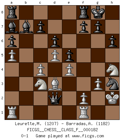 Last move : 0-1 2016 October 7 22:37:29 [Event "FICGS__CHESS__CLASS_F__000182"] [Site "FICGS"] [Date "2016.09.25"] [Round "1"] [White "Leurette,Marc-Antoine"] [Black "Barradas,Anderson"] [Result "0-1"] [WhiteElo "1207"] [BlackElo "1182"] 1.e4 e5 2.Nf3 Nc6 3.Bc4 Bc5 4.c3 Nf6 5.d3 h6 6.b4 Bb6 7.O-O O-O 8.b5 Ne7 9.a4 a6 10.bxa6 bxa6 11.a5 Bc5 12.Qe2 d6 13.h3 Ng6 14.d4 Ba7 15.d5 Bb7 16.Bd3 Nh5 17.c4 Ngf4 18.Bxf4 Nxf4 19.Qd2 Qf6 20.Nc3 Qg6 21.Nh4 Qg5 22.g3 Nxh3+ 23.Kh2 Qxd2 0-1 Giuoco Piano Kingside Castling by player White (move 7) Kingside Castling by player Black (move 7) Player Black won this chess game. Follow this game move after move (download)Human affairs are like a Chess game: only those who do not take it seriously can be called good players. (Hung Tzu Ch'eng) Intelligenz läßt sich nicht am Weg, sondern nur am Ergebnis feststellen. (Garry Kasparov) Las piezas de Ajedrez son los bloques del alfabeto que moldean los pensamientos; y esos pensamientos, aunque hagan un diseño visual en el tablero, expresan abstractamente su belleza como un poema. (Marcel Duchamp) Dieu déplace le joueur, et celui-ci la pièce. Quel Dieu derrière Dieu commence donc la trame ? Arturo Perez-Reverte (prix de littérature policière 1993). In every real man a child is hidden that wants to play. (Friedrich Nietzsche)