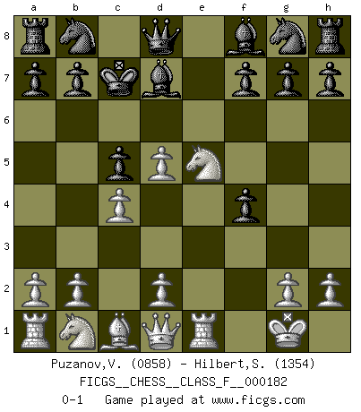 Last move : 0-1 2016 November 20 16:11:10 [Event "FICGS__CHESS__CLASS_F__000182"] [Site "FICGS"] [Date "2016.09.25"] [Round "1"] [White "Puzanov,Vasyl"] [Black "Hilbert,Stephan J."] [Result "0-1"] [WhiteElo "0858"] [BlackElo "1354"] 1.e4 e5 2.f4 exf4 3.Nf3 d5 4.exd5 c5 5.Bb5+ Bd7 6.O-O Bxb5 7.Re1+ Kd7 8.Ne5+ Kc7 9.c4 Bd7 0-1 KGA : Abbazia defense (Classical defense, Modern defense!) Kingside Castling by player White (move 6) Player Black won this chess game. Follow this game move after move (download)It is no time to be playing Chess when the house is on fire. (Italian Proverb) Die Partien sind immer verschieden, die Interviews immer die gleichen. (Garry Kasparov) El hombre es un frívolo, una creatura engañosa y como un jugador de Ajedrez, se preocupa mas por el proceso de obtener su meta que de la meta por sí misma. (Dostoyevsky) Les sacrifices démontrent seulement que quelqu'un a gaffé. (Savielly Tartacover) True nature is revealed in times of difficulty. (Chinese proverb)