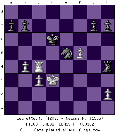 Last move : 0-1 2016 November 1 12:50:39 [Event "FICGS__CHESS__CLASS_F__000182"] [Site "FICGS"] [Date "2016.09.25"] [Round "1"] [White "Leurette,Marc-Antoine"] [Black "Nezumi,Mashi"] [Result "0-1"] [WhiteElo "1207"] [BlackElo "1335"] 1.e4 d6 2.d4 e5 3.dxe5 dxe5 4.Qxd8+ Kxd8 5.Nc3 Bb4 6.Bd2 Ba5 7.Nf3 Nc6 8.O-O-O Nge7 9.Nd5 Nxd5 10.exd5 Bxd2+ 11.Rxd2 Nb4 12.d6 cxd6 13.Rxd6+ Kc7 14.Rd2 Bf5 15.c3 Nxa2+ 16.Kd1 Rad8 17.Nxe5 Rxd2+ 18.Kxd2 Rd8+ 19.Bd3 f6 20.g4 fxe5 21.gxf5 e4 22.Ke3 exd3 23.Rd1 Rf8 24.Rxd3 Rxf5 25.f4 Nc1 26.Rd4 Nb3 27.Rb4 Na5 28.Ke4 Rh5 29.f5 Nc6 30.Rc4 Kd6 31.b4 Rh4+ 32.Kd3 Ne5+ 0-1 King's pawn Opening Queenside Castling by player White (move 8) Player Black won this chess game. Follow this game move after move (download)The battle for the ultimate truth will never be won. And that's why Chess is so fascinating. (Hans Kmoch) Rauchen ist dem Schachspieler bei seiner Arbeit, also im Wettkampf, untersagt. (Viktor Kortschnoi) El Ajedrez lo es todo: arte, ciencia y deporte. (Anatoly Karpov) Un millionnaire : 'Monsieur Steinitz ! Vous ne participez aux tournois que pour l'argent, alors que moi je n'y viens que pour l'honneur.' Steinitz : 'Chacun joue pour ce qu'il n'a pas'... Beta. Software undergoes beta testing shortly before it's released. Beta is latin for still doesn't work. (Anonymous)