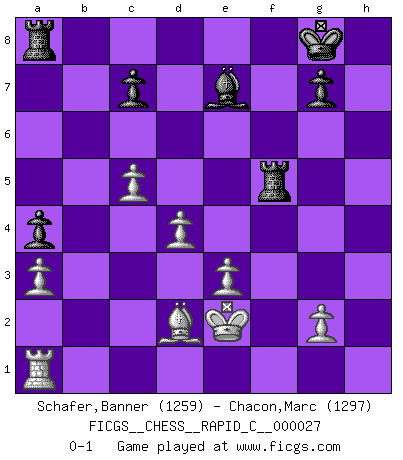 Last move : 0-1 2007 May 5 2:37:14 [Event "FICGS__CHESS__RAPID_C__000027"] [Site "FICGS"] [Date "2007.03.27"] [Round "1"] [White "Schafer,Banner"] [Black "Chacon,Marc"] [Result "0-1"] [WhiteElo "1259"] [BlackElo "1297"] 1.d4 d5 2.c4 e6 3.e3 Nf6 4.c5 Nc6 5.Nf3 Be7 6.Bb5 Bd7 7.Bxc6 Bxc6 8.Ne5 O-O 9.Nd2 Ne4 10.Nxe4 dxe4 11.O-O Bd5 12.Bd2 f6 13.Ng4 b6 14.b4 a5 15.a3 bxc5 16.bxc5 a4 17.h3 Bb3 18.Qe2 Qd5 19.f3 Bc4 20.Qf2 Bxf1 21.Kxf1 h5 22.fxe4 Qc4+ 23.Qe2 Qxe2+ 24.Kxe2 hxg4 25.hxg4 f5 26.exf5 exf5 27.gxf5 Rxf5 0-1 Queen's gambit declined Kingside Castling by player Black (move 8) Kingside Castling by player White (move 11) Player Black won this chess game. Follow this game move after move (download)It is the aim of the modern school, not to treat every position according to one general law, but according to the principle inherent in the position. (Richard Reti) Wer sich die Fähigkeit anerziehen will im Schach selbstständig zu denken, der muß alles meiden, was leblos ist: ausgeklügelte Theorien, die sich auf sehr wenige Beispiele und eine Menge Hirngespinste stützen. (Emanuel Lasker) A través de las casillas del tablero, los Indios explican el movimiento del tiempo y la edad, las influencias mas altas que controlan el mundo y los lazos que vinculan al Ajedrez con el alma humana. (Al-Masudi) La solitude du joueur d'Echecs à l'approche du mat est semblable à celle du condamné. (Francis Szpiner) Now the reason the enlightened prince and the wise general conquer the enemy whenever they move and their achievements surpass those of ordinary men is foreknowledge. (Sun Tzu)