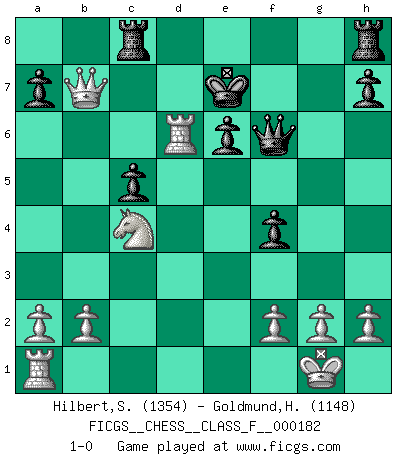 Last move : 1-0 2016 October 27 12:12:53 [Event "FICGS__CHESS__CLASS_F__000182"] [Site "FICGS"] [Date "2016.09.25"] [Round "1"] [White "Hilbert,Stephan J."] [Black "Goldmund,Heike"] [Result "1-0"] [WhiteElo "1354"] [BlackElo "1148"] 1.Nf3 Nf6 2.d4 e6 3.Bf4 c5 4.c3 b6 5.e3 Bb7 6.Bd3 d6 7.O-O Be7 8.Nbd2 Nd5 9.Bg3 Nd7 10.e4 Nc7 11.Qe2 Nf6 12.e5 Nfd5 13.c4 Nb4 14.Be4 Bxe4 15.Nxe4 d5 16.cxd5 Nbxd5 17.Nd6+ Kd7 18.Nxf7 Qf8 19.Nd6 Nf4 20.Qe4 Ncd5 21.dxc5 bxc5 22.Rfd1 g5 23.Bxf4 Bxd6 24.exd6 gxf4 25.Ne5+ Kxd6 26.Nc4+ Ke7 27.Rxd5 Rc8 28.Rd6 Qf6 29.Qb7+ 1-0 Reti Opening Kingside Castling by player White (move 7) Player White won this chess game. Follow this game move after move (download)It is peculiar but a fact nevertheless, that gamblers in chess always have enthusiastic followers. (Botvinnik) Ich hatte meine größten Erfolge, als ich 47 Jahre alt war. Kasparow war noch nicht mal 42 und hat das Schach schon im Stich gelassen. (Viktor Kortschnoi) Con o sin el título, Bobby Fischer fue sin lugar a dudas el mas grande jugador de su época. (Burt Hochberg) Nous vivons dans un monde échiquéen : chaque jour qui passe est un défi à relever. (Philosophe Sasha) Creativity is allowing yourself to make mistakes. Art is knowing which ones to keep. (Scott Adams)