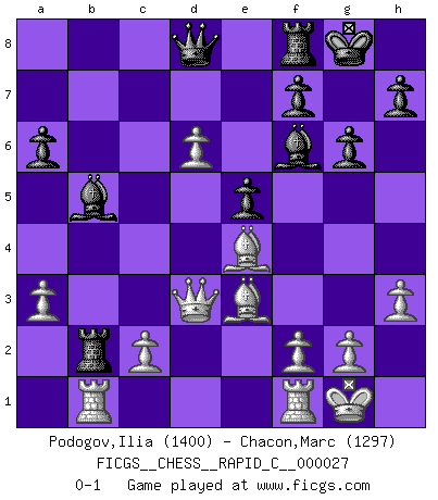 Last move : 0-1 2007 May 18 3:49:46 [Event "FICGS__CHESS__RAPID_C__000027"] [Site "FICGS"] [Date "2007.03.27"] [Round "1"] [White "Podogov,Ilia"] [Black "Chacon,Marc"] [Result "0-1"] [WhiteElo "1400"] [BlackElo "1297"] 1.e4 c5 2.Nf3 d6 3.d4 cxd4 4.Nxd4 Nf6 5.Nc3 a6 6.Bd3 Bd7 7.O-O e5 8.Nf3 Nc6 9.h3 Be7 10.a3 O-O 11.Be3 Rc8 12.Nd5 Nxd5 13.exd5 e4 14.Bxe4 Ne5 15.Nxe5 dxe5 16.d6 Bf6 17.Bxb7 Rb8 18.Be4 Rxb2 19.Qd3 g6 20.Rab1 Bb5 0-1 This chess game has been lost on time (started : 2007.03.27 10:42:51) Sicilian : Najdorf Kingside Castling by player White (move 7) Kingside Castling by player Black (move 10) Player Black won this chess game. Follow this game move after move (download)Place the contents of the Chess box in a hat, shake them up vigorously, pour them on the board from a height of two feet, and you get the style of Steinitz. (H. E. Bird) Der beste Spieler in einem Turnier gewinnt es nie. Er landet auf Platz zwei oder drei. (Siegbert Tarrasch) Un buen sacrificio es aquel que aunque no sea necesariamente sólido, deja a tu oponente aturdido y confuso. (Rudolph Spielmann) Les échecs, c'est l'art d'analyser. (Mikhail Botvinnik) Memory is a way of holding onto the things you love, the things you are, the things you never want to lose. (from the television show: The Wonder Years)