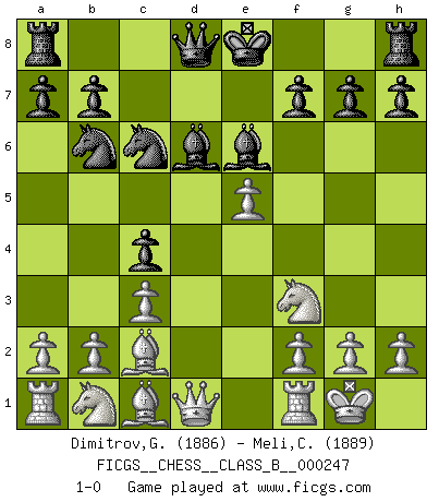 Last move : 1-0 2017 January 4 10:15:16 [Event "FICGS__CHESS__CLASS_B__000247"] [Site "FICGS"] [Date "2016.09.28"] [Round "1"] [White "Dimitrov,George"] [Black "Meli,Cosimo Leonardo"] [Result "1-0"] [WhiteElo "1886"] [BlackElo "1889"] 1.e4 c5 2.c3 Nf6 3.e5 Nd5 4.Nf3 Nc6 5.Bc4 Nb6 6.Bb3 c4 7.Bc2 d6 8.exd6 e5 9.O-O Be6 10.d4 Bxd6 11.dxe5 1-0 This chess game has been lost on time (started : 2016.09.28 12:43:11) Sicilian : Alapin's variation (2.c3) Kingside Castling by player White (move 9) Player White won this chess game. Follow this game move after move (download)You need not play well - just help your opponent to play badly. (Genrikh Chepukaitis) Wenn man heute mit 14 Jahren noch kein GM ist, kann man es vergessen. (Viswanathan Anand) Cuando no sepas que mover, espera por una idea que se le venga a la la cabeza de tu oponente. Tenlo por seguro de que esa idea estará incorrecta. (Siegbert Tarrasch) Les sacrifices démontrent seulement que quelqu'un a gaffé. (Savielly Tartacover) Fame, I have already. Now I need the money. (an elderly Steinitz)