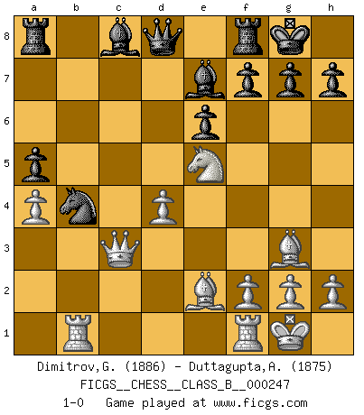 Last move : 1-0 2017 February 19 16:0:17 [Event "FICGS__CHESS__CLASS_B__000247"] [Site "FICGS"] [Date "2016.09.28"] [Round "1"] [White "Dimitrov,George"] [Black "Duttagupta,Aniruddha"] [Result "1-0"] [WhiteElo "1886"] [BlackElo "1875"] 1.e4 c5 2.c3 d5 3.exd5 Qxd5 4.d4 e6 5.Nf3 Nf6 6.Be2 Nc6 7.O-O cxd4 8.cxd4 Be7 9.Nc3 Qd6 10.Nb5 Qd8 11.Bf4 Nd5 12.Bg3 O-O 13.a3 a6 14.Nc3 b5 15.a4 Nxc3 16.bxc3 b4 17.Qd2 a5 18.Rab1 bxc3 19.Qxc3 Nb4 20.Ne5 1-0 This chess game has been lost on time (started : 2016.09.28 12:43:11) Sicilian : Alapin's variation (2.c3) Kingside Castling by player White (move 7) Kingside Castling by player Black (move 12) Player White won this chess game. Follow this game move after move (download)Only sissies Castle. (Rob Sillars) Du weisst es gibt ein Problem mit Computern und Fernschach, wenn jeder eine Rating von 2450 hat. (John Christen Knudsen) La única cosa que los jugadores de Ajedrez tienen en común, es el Ajedrez. (Lodewijk Prins) Mais l'homme est une créature légère et illogique : semblable au joueur d'échecs, il n'aime que le processus du but à atteindre, non le but lui-même. (Dostoïevsky) There are more things in heaven and earth than practically anywhere else. (Unknown)