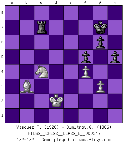 Last move : 1/2-1/2 2017 November 14 5:21:32 [Event "FICGS__CHESS__CLASS_B__000247"] [Site "FICGS"] [Date "2016.09.28"] [Round "1"] [White "Vasquez,Fernando"] [Black "Dimitrov,George"] [Result "1/2-1/2"] [WhiteElo "1920"] [BlackElo "1886"] 1.e4 e5 2.Nf3 Nc6 3.d4 exd4 4.Nxd4 Nf6 5.Nxc6 bxc6 6.e5 Qe7 7.Qe2 Nd5 8.c4 Ba6 9.b3 g6 10.g3 Bg7 11.Bb2 O-O 12.Bg2 Rae8 13.O-O Bxe5 14.Qxe5 Qxe5 15.Bxe5 Rxe5 16.cxd5 Bxf1 17.Kxf1 cxd5 18.f4 Re3 19.Bxd5 Rd3 20.Bf3 Re8 21.Kf2 Kf8 22.Na3 Rd2+ 23.Kg1 d5 24.Nb5 c5 25.Rf1 c4 26.Nc3 cxb3 27.axb3 d4 28.Ne4 Rb2 29.Nc5 Re3 30.Bd5 R3e2 31.Nd3 Rbd2 32.Ne5 f6 33.Nf3 Rb2 34.Rd1 d3 35.Ne1 Rbd2 36.Ra1 Rxh2 37.Bg2 Rh5 38.Nf3 Rb2 39.Nd4 d2 40.Rd1 Ra5 41.Bf3 f5 42.Kf1 Ra3 43.Ke2 Ra6 44.Kd3 Rd6 45.Kc3 Ra2 46.Be2 a5 47.Bd3 h5 48.Nf3 a4 49.Ne5 Ra3 50.Bc2 axb3 51.Bxb3 Ra7 52.Nc4 Rc7 53.Rxd2 Rxd2 54.Kxd2 Kg7 1/2-1/2 Scotch : Mieses variation Kingside Castling by player Black (move 11) Kingside Castling by player White (move 13) 10 pieces endgame at move 54 : White KBNPP , Black KRPPP WHITE : King + 1 Bishop 1 Knight 2 Pawns BLACK : King + 1 Rook 3 Pawns This chess game ended in a draw. Follow this game move after move (download)I still hope to kill Fischer. (Boris Spassky) Stil? Ich habe keinen Stil! (Anatoly Karpov) Buenas posiciones no logran ganar juegos, buenas movidas sí. (Gerald Abrahams) Karpov est une pièce de musée. (Garry Kasparov) Remember : Your focus determines your reality. (Qui-Gon Jinn in Star Wars ep.1)