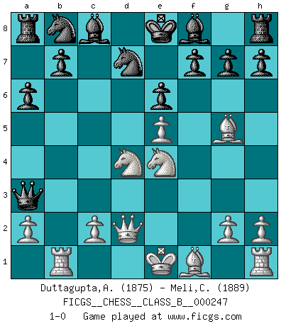 Last move : 1-0 2017 January 4 22:24:56 [Event "FICGS__CHESS__CLASS_B__000247"] [Site "FICGS"] [Date "2016.09.28"] [Round "1"] [White "Duttagupta,Aniruddha"] [Black "Meli,Cosimo Leonardo"] [Result "1-0"] [WhiteElo "1875"] [BlackElo "1889"] 1.e4 c5 2.Nf3 d6 3.d4 cxd4 4.Nxd4 Nf6 5.Nc3 a6 6.Bg5 e6 7.f4 Qb6 8.Qd2 Qxb2 9.Rb1 Qa3 10.e5 dxe5 11.fxe5 Nfd7 12.Ne4 1-0 Sicilian : Najdorf, 7...Qb6 Player White won this chess game. Follow this game move after move (download)By the beauty of his games, the clarity of his play, and the brilliance of his ideas, Fischer made himself an artist of the same stature as Brahms, Rembrandt, and Shakespeare. (David Levy) Ein Remis kann durch Wiederholung von drei Zügen oder durch einen schlechte Zug erreicht werden. (Savielly Grigorievitsch Tartakower) No soy una persona materialista y por eso, no resiento la falta o pérdida del dinero. La ausencia de cosas mundanas carece de importancia. Ya que el Ajedrez es una forma en la que puedo ser tan materialista como yo desee sin tener la necesidad de vender mi alma. (Jamie Walter Adams) Vous n'êtes pas toujours obligé de jouer le meilleur coup. Un coup doit être actif, entreprenant, correct et beau ! (David Bronstein) I live to kill Traxler counterattack. (Ilmars Cirulis)