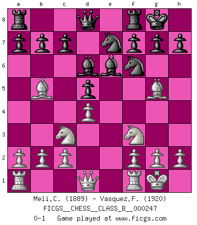 Last move : 0-1 2017 February 10 2:49:25 [Event "FICGS__CHESS__CLASS_B__000247"] [Site "FICGS"] [Date "2016.09.28"] [Round "1"] [White "Meli,Cosimo Leonardo"] [Black "Vasquez,Fernando"] [Result "0-1"] [WhiteElo "1889"] [BlackElo "1920"] 1.e4 e5 2.Nf3 Nf6 3.Nxe5 d6 4.Nf3 Nxe4 5.d4 d5 6.Bd3 Nf6 7.Bf1 Nc6 8.Nc3 Bd6 9.Bg5 Be6 10.Bb5 O-O 11.O-O Ne7 0-1 Petrov : Classical attack Kingside Castling by player Black (move 10) Kingside Castling by player White (move 11) Player Black won this chess game. Follow this game move after move (download)A strong memory, concentration, imagination, and a strong will is required to become a great Chess player. (Bobby Fischer) Vielleicht wirkt die Aura früherer Spieler glanzvoller als die der heutigen Spieler, aber das liegt daran, dass man kein Programm wie Fritz hatte, das einem all die Löcher in ihren Partien zeigt. (Vladimir Kramnik) Jugadores de primera clase pierden en contra de jugadores de segunda clase porque los jugadores de segunda clase a veces juegan una partida de primer clase. (Siegbert Tarrasch) Mais n'est-ce pas déjà le limiter injurieusement que d'appeler les échecs un jeu? N'est-ce pas aussi une science, un art, ou quelque chose qui, comme le cercueil de Mahomet entre ciel et terre, est suspendu entre l'un et l'autre, et qui réunit un nombre incroyable de contraires ? (Stefan Zweig) When you don't know what to do, walk fast and look worried. (Anonymous)