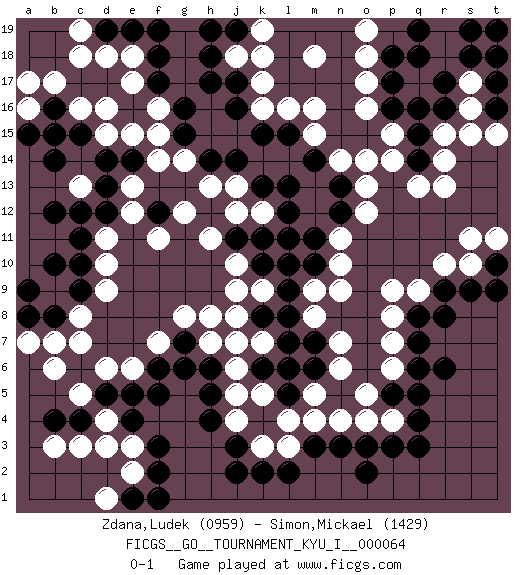 Last move : 0-1 2016 December 4 23:33:36 [Event "FICGS__GO__TOURNAMENT_KYU_I__000064"] [Site "FICGS"] [Date "2016.09.29"] [Round "1"] [Black "Zdana,Ludek"] [White "Simon,Mickael"] [Result "0-1"] [Rating 1 "0959"] [Rating 2 "1429"] 1.q16 d4 2.q3 d16 3.r9 o17 4.p17 o16 5.q14 k17 6.k15 o14 7.f17 e17 8.h17 f16 9.g16 f15 10.j16 k16 11.l15 m16 12.g15 f14 13.f18 e18 14.h18 m18 15.l13 n4 16.p5 n6 17.o2 p7 18.r6 p9 19.m3 r10 20.q7 r15 21.q15 r14 22.r16 r13 23.d12 d10 24.f12 g14 25.h14 h13 26.b12 g12 27.c15 c16 28.b16 b17 29.b14 a16 30.d14 c13 31.c12 f11 32.c10 d9 33.c9 c8 34.b8 c7 35.f3 e3 36.h4 q13 37.l11 j13 38.j14 r18 39.q18 s16 40.r17 s17 41.s18 r19 42.q19 o18 43.p18 q9 44.r8 b7 45.a9 j10 46.l9 m4 47.n3 l4 48.j2 j4 49.j3 l3 50.l2 j5 51.f5 e6 52.f6 f7 53.e5 d6 54.d5 c5 55.e4 d3 56.h5 j6 57.h6 h7 58.g7 g8 59.g6 h8 60.f2 e2 61.e1 d1 62.f1 e12 63.b15 d11 64.c11 e13 65.d13 o4 66.p3 p4 67.q4 p6 68.q6 s10 69.s9 n11 70.m11 n10 71.m7 n7 72.l7 m15 73.m14 n14 74.n13 o13 75.n12 o12 76.m10 k3 77.k2 a7 78.b10 t18 79.s19 o5 80.q5 n9 81.j11 h11 82.k10 j9 83.k13 j12 84.k11 k9 85.k8 j8 86.k6 m9 87.m6 m5 88.l5 k5 89.l6 j7 90.l8 m8 91.t19 s15 92.t10 t11 93.t9 s11 94.t17 j18 95.j17 k18 96.e19 d18 97.d19 c19 98.f19 c18 99.a15 k7 100.l10 a17 101.c4 c3 102.c6 b6 103.b4 b3 104.a8 k12 105.l12 l16 106.o3 d15 107.e14 e15 108.t16 t15 109.t18 p14 110.q8 p8 111.j19 k19 112.h19 p15 113.p16 o19 0-1 Here are the names of the openings (joseki) played in the four corners : Corner q16 : q16 o17 Hoshi (Hwajeom, Seongjeom, Xingwei`) 4-4 Point. The star or hoshi (4-4) point, emphasizing influence at the potential expense of territory. Ikken Kakari (Hankan Keolch'im, Yi Gua`jiao~, 1-Space Low Approach). White 2 is the standard approach move to the 4-4. Corner d16 : d16 f17 Hoshi (Hwajeom, Seongjeom, Xingwei`) 4-4 Point. The star or hoshi (4-4) point, emphasizing influence at the potential expense of territory. Ikken Kakari (Hankan Keolch'im, Yi Gua`jiao~, 1-Space Low Approach). Black 2 is the standard approach move to the 4-4. Player White won this Go (weiqi, baduk) game. Follow this game move after move (download)On the third line, four die, six live. (Anonymous) Man is still the most extraordinary computer of all. (John F. Kennedy)