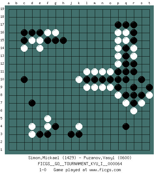 Last move : 1-0 2016 December 24 9:15:21 [Event "FICGS__GO__TOURNAMENT_KYU_I__000064"] [Site "FICGS"] [Date "2016.09.29"] [Round "1"] [Black "Simon,Mickael"] [White "Puzanov,Vasyl"] [Result "1-0"] [Rating 1 "1429"] [Rating 2 "0600"] 1.r16 q16 2.q17 p16 3.r15 r14 4.p17 q15 5.q14 p14 6.q13 r13 7.q12 p13 8.r17 d4 9.d16 d15 10.e16 e15 11.c15 c14 12.c16 p15 13.f15 e14 14.q4 p12 15.r12 q11 16.r11 r10 17.q10 p10 18.p11 o11 19.q11 q9 20.o10 o9 21.n10 n9 22.m10 m9 23.p9 p8 24.p10 n11 25.f3 f4 26.g4 f5 27.e3 d3 28.k3 k4 29.j3 m11 30.l10 l11 31.c10 l9 32.d7 k10 33.r9 r8 34.q8 q7 35.s10 s9 36.s8 s7 37.r7 r6 38.r8 t8 39.t9 f16 40.g15 g16 41.h15 1-0 This go game has been lost on time (started : 2016.09.29 6:4:35) Here are the names of the openings (joseki) played in the four corners : Corner q16 : r16 q16 Komoku (Somok, Xiao~mu`) 3-4 Point. The komoku (3-4) point is the traditional corner enclosure move.. Corner d16 : d16 d15 Hoshi (Hwajeom, Seongjeom, Xingwei`) 4-4 Point. The star or hoshi (4-4) point, emphasizing influence at the potential expense of territory. Corner q4 : q4 q9 Hoshi (Hwajeom, Seongjeom, Xingwei`) 4-4 Point. The star or hoshi (4-4) point, emphasizing influence at the potential expense of territory. Corner d4 : d4 f3 Hoshi (Hwajeom, Seongjeom, Xingwei`) 4-4 Point. The star or hoshi (4-4) point, emphasizing influence at the potential expense of territory. Ikken Kakari (Hankan Keolch'im, Yi Gua`jiao~, 1-Space Low Approach). Black 2 is the standard approach move to the 4-4. Player Black won this Go (weiqi, baduk) game. Follow this game move after move (download)In an unreasonable situation, an unreasonable move is reasonable. (Tamino) Empty your mind, be formless, shapeless — like water. (Bruce Lee)
