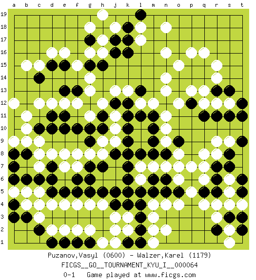 Last move : 0-1 2017 April 27 19:17:19 [Event "FICGS__GO__TOURNAMENT_KYU_I__000064"] [Site "FICGS"] [Date "2016.09.29"] [Round "1"] [Black "Puzanov,Vasyl"] [White "Walzer,Karel"] [Result "0-1"] [Rating 1 "0600"] [Rating 2 "1179"] 1.k5 q16 2.q15 p16 3.p15 n16 4.l5 d4 5.d5 e4 6.e5 g4 7.g5 d16 8.d10 q4 9.q5 p5 10.k10 q6 11.r5 r4 12.r6 q7 13.r7 r8 14.f5 h4 15.h5 h17 16.j17 l17 17.k17 h16 18.j16 q12 19.d15 e16 20.e15 m4 21.l4 q8 22.m8 n13 23.a8 r14 24.q14 r15 25.r13 q13 26.b6 f4 27.c4 c3 28.b3 b4 29.a4 c5 30.c6 a5 31.m5 n4 32.n5 o4 33.k8 j13 34.h10 g14 35.l8 d12 36.d11 e12 37.e11 f12 38.e10 n10 39.m10 n9 40.n8 o8 41.j5 k3 42.l3 m3 43.l2 k2 44.k1 j1 45.l1 j2 46.j12 k13 47.k12 l12 48.l11 m12 49.m11 n11 50.m9 n2 51.a3 b5 52.a6 c4 53.c2 d2 54.o5 o6 55.a7 l18 56.k16 c12 57.c10 b11 58.j4 j3 59.k4 h12 60.h11 g11 61.g10 b10 62.a10 b9 63.f10 c8 64.a11 a12 65.d6 d8 66.q11 r12 67.r11 s12 68.s11 s9 69.s7 s5 70.t5 t4 71.t3 s4 72.s3 r3 73.r2 s2 74.t2 s1 75.h18 g18 76.g17 j18 77.k18 h19 78.l19 n18 79.t11 e8 80.d7 f7 81.g7 g8 82.h7 h8 83.j8 h9 84.d1 e2 85.p12 p13 86.p14 o15 87.o14 n14 88.o13 o12 89.s8 r9 90.t9 s6 91.t6 j9 92.k9 j11 93.k11 j10 94.g9 f8 95.f6 a9 96.b8 c9 97.f13 g13 98.e13 c15 99.c14 b15 100.o7 n7 101.n6 p7 102.t12 m7 103.m6 l7 104.k7 m1 105.l13 e7 106.g6 c7 107.h15 g16 108.g15 f15 109.s13 l6 110.k6 o7 111.o9 m2 112.e1 f2 113.f1 g2 114.g1 h1 0-1 Here are the names of the openings (joseki) played in the four corners : Corner q16 : q16 q15 Hoshi (Hwajeom, Seongjeom, Xingwei`) 4-4 Point. The star or hoshi (4-4) point, emphasizing influence at the potential expense of territory. Corner d4 : d4 d5 Hoshi (Hwajeom, Seongjeom, Xingwei`) 4-4 Point. The star or hoshi (4-4) point, emphasizing influence at the potential expense of territory. Corner q4 : l5 q4 This joseki is unknown. A weak or weird move has probably been played in this corner. Player White won this Go (weiqi, baduk) game. Follow this game move after move (download)The nature of a game comes from what is played, but it's the sensitivity to the possible and the impossible that gives it value. (Pierre Audouard) Big Chess is a place for big hallucinations. (Thibault de Vassal)