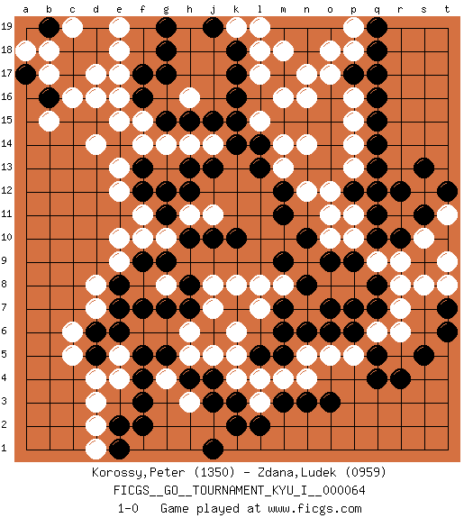Last move : 1-0 2017 January 21 23:10:36 [Event "FICGS__GO__TOURNAMENT_KYU_I__000064"] [Site "FICGS"] [Date "2016.09.29"] [Round "1"] [Black "Korossy,Peter"] [White "Zdana,Ludek"] [Result "1-0"] [Rating 1 "1350"] [Rating 2 "0959"] 1.q16 d4 2.q4 d16 3.f17 e17 4.f16 d14 5.k16 p18 6.p17 o17 7.q18 p16 8.q17 o18 9.m17 n16 10.q10 p15 11.q15 n14 12.q13 n17 13.f3 h3 14.f5 k4 15.m3 d2 16.f2 k6 17.k2 h6 18.f7 d7 19.j1 m4 20.n3 r6 21.r4 r9 22.r10 q9 23.q7 r7 24.q8 r8 25.p9 s10 26.s11 t9 27.s5 q6 28.o6 p10 29.o9 s12 30.r12 t11 31.s13 r11 32.q11 p11 33.q12 o12 34.m7 k8 35.k10 e9 36.f9 e10 37.h8 j7 38.l5 l4 39.m5 n4 40.o3 k5 41.f13 e12 42.f12 e13 43.l14 m16 44.m12 n12 45.m11 l17 46.k17 l18 47.k18 m18 48.n10 o10 49.c17 d17 50.c18 c16 51.g5 h5 52.j3 g4 53.f4 g8 54.g7 f11 55.g11 f10 56.g9 g10 57.h10 f14 58.g12 h14 59.j13 e15 60.g15 g14 61.j15 j14 62.k14 h11 63.h12 j11 64.j10 n5 65.n6 l7 66.m6 o5 67.p6 n9 68.m9 m8 69.n8 l8 70.j4 j5 71.h4 j8 72.d18 e18 73.b16 b15 74.a17 b18 75.b19 a18 76.d19 e19 77.g18 p14 78.q14 p13 79.s11 p5 80.q5 r11 81.t7 s8 82.s11 p8 83.p7 r11 84.t6 t8 85.s11 o8 86.o7 r11 87.p12 o11 88.s11 b17 89.t12 c19 90.e8 d8 91.k3 l3 92.l2 m13 93.l13 m14 94.d5 c5 95.d6 c6 96.e7 d3 97.q19 p19 98.g19 h16 99.h15 l15 100.k15 f15 101.g17 e5 102.e6 e4 103.h7 k19 104.j19 l19 105.h13 e16 106.e1 d1 107.e2 1-0 Here are the names of the openings (joseki) played in the four corners : Corner d16 : d16 f17 Hoshi (Hwajeom, Seongjeom, Xingwei`) 4-4 Point. The star or hoshi (4-4) point, emphasizing influence at the potential expense of territory. Ikken Kakari (Hankan Keolch'im, Yi Gua`jiao~, 1-Space Low Approach). Black 2 is the standard approach move to the 4-4. Corner q16 : q16 p18 Hoshi (Hwajeom, Seongjeom, Xingwei`) 4-4 Point. The star or hoshi (4-4) point, emphasizing influence at the potential expense of territory. Corner d4 : d4 f3 Hoshi (Hwajeom, Seongjeom, Xingwei`) 4-4 Point. The star or hoshi (4-4) point, emphasizing influence at the potential expense of territory. Ikken Kakari (Hankan Keolch'im, Yi Gua`jiao~, 1-Space Low Approach). Black 2 is the standard approach move to the 4-4. Player Black won this Go (weiqi, baduk) game. Follow this game move after move (download)Connect with good shape. (Anonymous) After growing wildly for years, the field of computing appears to be reaching its infancy. (John Pierce)