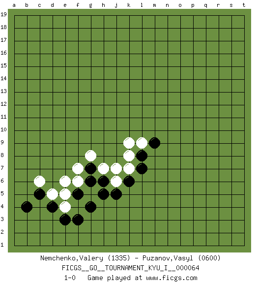 Last move : 1-0 2016 November 18 1:44:22 [Event "FICGS__GO__TOURNAMENT_KYU_I__000064"] [Site "FICGS"] [Date "2016.09.29"] [Round "1"] [Black "Nemchenko,Valery"] [White "Puzanov,Vasyl"] [Result "1-0"] [Rating 1 "1335"] [Rating 2 "0600"] 1.d4 d5 2.f5 e6 3.f3 f6 4.g6 f7 5.g7 g8 6.h5 e4 7.e3 e5 8.g4 h7 9.h6 j6 10.j5 j7 11.k6 k7 12.l7 k8 13.l8 k9 14.c5 c6 15.b4 l9 16.m9 1-0 Here are the names of the openings (joseki) played in the four corners : Corner d4 : d4 d5 Hoshi (Hwajeom, Seongjeom, Xingwei`) 4-4 Point. The star or hoshi (4-4) point, emphasizing influence at the potential expense of territory. Player Black won this Go (weiqi, baduk) game. Follow this game move after move (download)Avoid the plate connection. (Anonymous) Lamb in skin of tiger, still fears the wolf. (Chinese proverb)