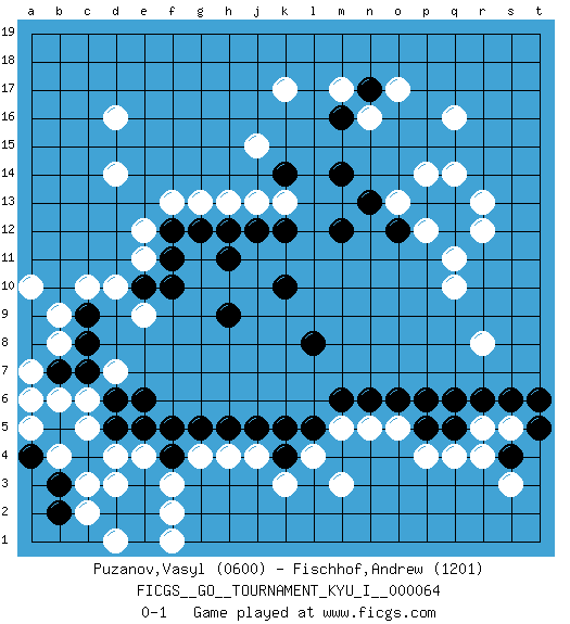 Last move : 0-1 2017 January 31 22:44:27 [Event "FICGS__GO__TOURNAMENT_KYU_I__000064"] [Site "FICGS"] [Date "2016.09.29"] [Round "1"] [Black "Puzanov,Vasyl"] [White "Fischhof,Andrew"] [Result "0-1"] [Rating 1 "0600"] [Rating 2 "1201"] 1.l8 d4 2.d5 e4 3.e5 d16 4.f4 f3 5.e3 d3 6.e2 f2 7.d2 c2 8.b2 d1 9.e1 f1 10.c4 g4 11.f5 q4 12.q5 p4 13.p5 o5 14.o6 n5 15.b3 r5 16.g5 h4 17.h5 j4 18.j5 d10 19.k4 k3 20.n6 l4 21.k5 m3 22.l5 m5 23.m6 q16 24.r6 q10 25.q6 c6 26.d6 c5 27.c7 b4 28.b5 c3 29.a4 b6 30.a6 a5 31.b7 a7 32.a8 a6 33.k10 b8 34.c8 b9 35.c9 c10 36.e10 e9 37.a9 a10 38.h11 d7 39.e6 e11 40.f10 k17 41.h9 r8 42.m12 d14 43.f11 e12 44.f12 f13 45.p6 r13 46.q13 r12 47.q12 q14 48.s6 s5 49.t5 g13 50.g12 h13 51.h12 j13 52.j12 k13 53.k12 p14 54.p13 o13 55.o12 q11 56.m14 p12 57.n13 n16 58.n17 o17 59.m16 m17 60.s4 s3 61.t6 r4 62.k14 j15 0-1 Here are the names of the openings (joseki) played in the four corners : Corner d4 : d4 d5 Hoshi (Hwajeom, Seongjeom, Xingwei`) 4-4 Point. The star or hoshi (4-4) point, emphasizing influence at the potential expense of territory. Corner q4 : l8 q4 This joseki is unknown. A weak or weird move has probably been played in this corner. Corner d16 : d16 h11 Hoshi (Hwajeom, Seongjeom, Xingwei`) 4-4 Point. The star or hoshi (4-4) point, emphasizing influence at the potential expense of territory. Corner q16 : q16 m12 Hoshi (Hwajeom, Seongjeom, Xingwei`) 4-4 Point. The star or hoshi (4-4) point, emphasizing influence at the potential expense of territory. Player White won this Go (weiqi, baduk) game. Follow this game move after move (download)Learning josekis by heart is useless if you don't try departing from them. (Pierre Audouard) Looking at the proliferation of personal web pages on the Net, it looks like very soon everyone on Earth will have 15 megabytes of fame. (M.G. Sriram)