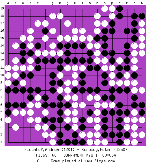 Last move : 0-1 2017 April 8 23:53:21 [Event "FICGS__GO__TOURNAMENT_KYU_I__000064"] [Site "FICGS"] [Date "2016.09.29"] [Round "1"] [Black "Fischhof,Andrew"] [White "Korossy,Peter"] [Result "0-1"] [Rating 1 "1201"] [Rating 2 "1350"] 1.r16 d16 2.q3 d4 3.q5 n4 4.f4 f3 5.g3 e3 6.g4 k4 7.g6 d6 8.f7 l6 9.f16 f17 10.g17 e17 11.h16 d14 12.p16 l16 13.q10 k10 14.l14 k15 15.k14 n16 16.o14 o17 17.p17 j17 18.j16 k16 19.j14 g18 20.h17 h18 21.c12 c9 22.e12 f13 23.f12 g13 24.d8 d11 25.c8 d12 26.c13 c11 27.d13 e13 28.c14 c15 29.g12 h13 30.g10 n14 31.k12 j11 32.m12 j15 33.h14 h15 34.h12 g14 35.e14 d15 36.j13 g16 37.b11 b10 38.d10 b12 39.e11 a11 40.c10 b11 41.b9 b14 42.b6 b3 43.l9 j8 44.k8 j7 45.j6 k7 46.h9 j9 47.h7 l11 48.m11 o6 49.p7 r4 50.q4 r3 51.r5 q2 52.p2 s5 53.s6 s4 54.r2 s2 55.q1 s1 56.t3 t2 57.t5 s3 58.o7 n7 59.n8 m7 60.m8 n2 61.k2 j2 62.j3 k3 63.h2 l2 64.j1 n13 65.o13 n12 66.n11 o12 67.p12 o11 68.o10 p11 69.q11 p10 70.o9 p9 71.p8 q9 72.q8 r9 73.s10 r10 74.r11 q12 75.p13 s11 76.r12 s12 77.r13 s13 78.r14 t16 79.s16 t15 80.t14 s14 81.s15 t17 82.s18 f2 83.o5 n5 84.o4 s8 85.s7 e7 86.e8 c5 87.c6 b5 88.d7 e6 89.l10 k11 90.l12 p6 91.r8 s9 92.q6 h8 93.g8 h10 94.g9 j5 95.h5 j4 96.h4 k6 97.e5 e4 98.f6 d5 99.o2 n1 100.o18 n18 101.o16 n17 102.t6 t4 103.t18 t13 104.s17 t14 105.n15 m15 106.o15 m14 107.m13 a9 108.b8 p18 109.q18 o19 110.p5 n6 111.h11 k9 112.l8 n3 113.o3 o1 114.l1 m1 115.k1 g2 116.l3 m2 117.l4 h6 118.g15 f15 119.j6 k5 120.m5 m4 121.a8 a10 122.q19 p19 123.j12 g1 124.h1 t8 125.a5 a4 126.a6 l15 127.h6 f5 128.j10 r1 129.q2 h10 0-1 Here are the names of the openings (joseki) played in the four corners : Corner d4 : d4 f4 Hoshi (Hwajeom, Seongjeom, Xingwei`) 4-4 Point. The star or hoshi (4-4) point, emphasizing influence at the potential expense of territory. Ikken Takagakari (Hankan Nop'dakeolch'im, Yi Gaojia, 1-Space High Approach). White typically responds at 6-4 or 3-10. White 4-10 is played when White finds play on the right side advantageous. White 4-8 or 3-8 may be played when White has support at top. Corner d16 : d16 f16 Hoshi (Hwajeom, Seongjeom, Xingwei`) 4-4 Point. The star or hoshi (4-4) point, emphasizing influence at the potential expense of territory. Ikken Takagakari (Hankan Nop'dakeolch'im, Yi Gaojia, 1-Space High Approach). White typically responds at 6-4 or 3-10. White 4-10 is played when White finds play on the right side advantageous. White 4-8 or 3-8 may be played when White has support at top. Player White won this Go (weiqi, baduk) game. Follow this game move after move (download)Don't disturb symmetry. (Anonymous) Have no fear of perfection - you'll never reach it. (Salvador Dali)