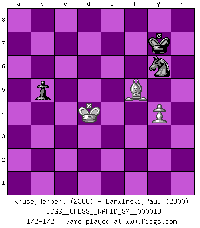 Last move : 1/2-1/2 2017 February 2 16:56:41 [Event "FICGS__CHESS__RAPID_SM__000013"] [Site "FICGS"] [Date "2016.09.29"] [Round "1"] [White "Kruse,Herbert"] [Black "Larwinski,Paul"] [Result "1/2-1/2"] [WhiteElo "2388"] [BlackElo "2300"] 1.Nf3 d5 2.g3 c6 3.Bg2 Bg4 4.O-O Nd7 5.d4 e6 6.h3 Bh5 7.c4 Be7 8.cxd5 exd5 9.Nc3 Bxf3 10.Bxf3 Ngf6 11.Qb3 Qb6 12.Qxb6 Nxb6 13.Kg2 h6 14.a3 O-O 15.e3 Rfe8 16.Be2 Bd6 17.Bd3 a6 18.Rd1 g6 19.b3 h5 20.h4 Kg7 21.Ra2 Nbd7 22.f3 Rad8 23.Ne2 c5 24.Kf2 cxd4 25.Nxd4 Nc5 26.Bc2 Rc8 27.Bb2 Ncd7 28.Bd3 Nc5 29.Bf5 Rc7 30.Bc2 Be5 31.Rd2 Nfd7 32.Bd1 Ne6 33.Ne2 Bxb2 34.Raxb2 Nb6 35.Rbc2 Rc6 36.Nd4 R6c8 37.Ne2 Rc6 38.Nd4 R6c8 39.Rxc8 Rxc8 40.Nxe6+ fxe6 41.Rc2 a5 42.g4 Rxc2+ 43.Bxc2 hxg4 44.fxg4 Nd7 45.Kf3 b5 46.e4 d4 47.e5 g5 48.hxg5 Nc5 49.b4 axb4 50.axb4 Na6 51.Bb3 Nxb4 52.Bxe6 Nd3 53.Bf5 Nxe5+ 54.Ke4 Nf7 55.g6 Nh8 56.Kxd4 Nxg6 1/2-1/2 Reti : King's Indian attack (Barcza system) Kingside Castling by player White (move 4) Kingside Castling by player Black (move 14) 10 pieces endgame at move 51 : White KBPPP , Black KNPPP WHITE : King + 1 Bishop 3 Pawns BLACK : King + 1 Knight 3 Pawns 9 pieces endgame at move 52 : White KBPPP , Black KNPP WHITE : King + 1 Bishop 3 Pawns BLACK : King + 1 Knight 2 Pawns 8 pieces endgame at move 53 : White KBPP , Black KNPP WHITE : King + 1 Bishop 2 Pawns BLACK : King + 1 Knight 2 Pawns 7 pieces endgame at move 56 : White KBPP , Black KNP WHITE : King + 1 Bishop 2 Pawns BLACK : King + 1 Knight 1 Pawn 6 pieces endgame at move 56 : White KBP , Black KNP WHITE : King + 1 Bishop 1 Pawn BLACK : King + 1 Knight 1 Pawn This chess game ended in a draw. Follow this game move after move (download)By this measure (on the gap between Fischer & his contemporaries), I consider him the greatest world champion. (Garry Kasparov) Wir können eben der zündenden Macht des Opfers nicht wiederstehen, denn die Begeisterung für das Opfer liegt in der Natur des Menschen. (Rudolf Spielmann) Realmente no sabemos como el juego fue inventado, aunque hay sospechas. Tan pronto como descubramos a los culpables, se los haremos saber. (Bruce Pandolfini) En blitz, le Cavalier l'emporte sur le Fou. (Vlastimil Hort) Somehow our devils are never quite what we expect when we meet them face to face. (Nelson DeMille)