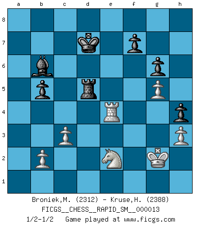 Last move : 1/2-1/2 2017 February 4 7:30:32 [Event "FICGS__CHESS__RAPID_SM__000013"] [Site "FICGS"] [Date "2016.09.29"] [Round "1"] [White "Broniek,Mariusz Maciej"] [Black "Kruse,Herbert"] [Result "1/2-1/2"] [WhiteElo "2312"] [BlackElo "2388"] 1.e4 c5 2.Nf3 d6 3.d4 cxd4 4.Nxd4 Nf6 5.Nc3 a6 6.h3 e5 7.Nde2 h5 8.g3 Be6 9.Bg2 b5 10.O-O Nbd7 11.Be3 Be7 12.Nd5 Nxd5 13.exd5 Bf5 14.f4 Rc8 15.c3 Bh7 16.fxe5 dxe5 17.d6 Bg5 18.Bf2 O-O 19.a4 Nf6 20.axb5 axb5 21.Ra6 Rb8 22.Rc6 Ne4 23.Qd5 Nxf2 24.Kxf2 h4 25.g4 Bc2 26.Be4 Bxe4 27.Qxe4 Rb6 28.Kf3 Re8 29.Rxb6 Qxb6 30.d7 Re6 31.Kg2 Bd8 32.Qd5 g6 33.Rf3 Kf8 34.Ng1 Ke7 35.Rf2 Qd6 36.Rd2 Bc7 37.Rd3 Qxd5+ 38.Rxd5 e4 39.Ne2 Rd6 40.Re5+ Kxd7 41.Rxe4 Bb6 42.g5 Rd5 1/2-1/2 Sicilian : Najdorf, Adams attack Kingside Castling by player White (move 10) Kingside Castling by player Black (move 18) This chess game ended in a draw. Follow this game move after move (download)No one ever won a game by resigning. (Unknown) Es ist nicht das erste mal, dass sich die FIDE dem Arabischen Geld gebeugt hat (über die FIDE WM 2004 in Lybien). (Larry Evans) Te sientas frente a un tablero y repentinamente tu corazón brinca. Tu mano tiembla al tomar una pieza y moverla. Pero lo que el Ajedrez te enseña es que tu debes permanecer ahí con calma y pensar de que si realmente es una buena idea o de que si hay otras ideas mejores. (Stanley Kubrick) Ce n'est pas pour s'amuser qu'il joue aux échecs : il célèbre un culte. (Vladimir Nabokov) The smarter you play, the luckier you'll be. (Mark Pilarski)