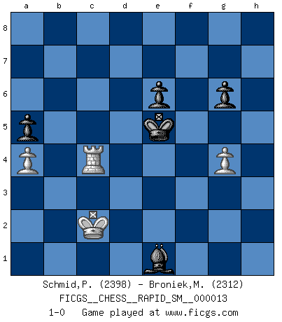 Last move : 1-0 2017 June 11 7:19:23 [Event "FICGS__CHESS__RAPID_SM__000013"] [Site "FICGS"] [Date "2016.09.29"] [Round "1"] [White "Schmid,Pablo"] [Black "Broniek,Mariusz Maciej"] [Result "1-0"] [WhiteElo "2398"] [BlackElo "2312"] 1.e4 c5 2.Nf3 Nc6 3.Bb5 e6 4.Bxc6 bxc6 5.b3 d5 6.d3 Nf6 7.O-O Be7 8.Qe2 Nd7 9.Re1 O-O 10.Nc3 Re8 11.Bf4 Bb7 12.e5 a5 13.Na4 Ba6 14.c4 Nb6 15.Bd2 Nxa4 16.bxa4 Rb8 17.Rab1 Qc7 18.Bc3 Red8 19.Red1 Rb4 20.Bxb4 cxb4 21.Nd4 Qb6 22.Nb3 c5 23.a3 dxc4 24.dxc4 Rxd1+ 25.Rxd1 bxa3 26.Qc2 g6 27.Nd2 Bb7 28.f4 Bf8 29.Ne4 Bxe4 30.Qxe4 Qb2 31.Qb1 Qc3 32.Qd3 Qb2 33.Rb1 Qd4+ 34.Qxd4 cxd4 35.Kf2 Bb4 36.Ra1 f6 37.Ke2 Kf7 38.g4 fxe5 39.fxe5 h5 40.c5 hxg4 41.c6 Ke8 42.Kd3 Kd8 43.Kxd4 Kc7 44.Rc1 Bd2 45.Rc2 Bf4 46.Ke4 Bh6 47.Rc3 Bf8 48.Kd3 Bb4 49.Rc2 Be1 50.Kc4 Kxc6 51.Re2 Bb4 52.Rg2 Be1 53.Kb3 g3 54.hxg3 Kd5 55.Kxa3 Bc3 56.g4 Kxe5 57.Kb3 Bb4 58.Rc2 Kd5 59.Rc4 Be1 60.Rc8 Ke5 61.Rc1 Bb4 62.Rc4 Be1 63.Kc2 1-0 Sicilian : Nimzovich-Rossolimo attack (without ...d6) Kingside Castling by player White (move 7) Kingside Castling by player Black (move 9) 10 pieces endgame at move 55 : White KRPPP , Black KBPPP WHITE : King + 1 Rook 3 Pawns BLACK : King + 1 Bishop 3 Pawns 9 pieces endgame at move 56 : White KRPP , Black KBPPP WHITE : King + 1 Rook 2 Pawns BLACK : King + 1 Bishop 3 Pawns Player White won this chess game. Follow this game move after move (download)Chess teaches you to control the initial excitement you feel when you see something that looks good and it trains you to think objectively when you're in trouble. (Stanley Kubrick) Weshalb minderdergeübte Spieler mit g2-g4 beginnen? Die betreffenden sind unschlüssig, ob sie nun rechts (h4) oder links (f4) beginnen sollen, und in ihrer Ratlosigkeit entschliessen sie sich nach guter Bürgerart dazu, den goldenen Mittelweg zu wählen. (Aaron Nimzowitsch) Peones: ellos son el alma de esta partida, solos forman el ataque y la defensa. (Philidor) Aidez vos pièces, elles vous aideront. (Paul Morphy) If you are going through hell, keep going. (Winston Churchill)