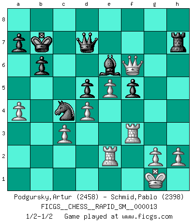 Last move : 1/2-1/2 2017 March 5 9:35:42 [Event "FICGS__CHESS__RAPID_SM__000013"] [Site "FICGS"] [Date "2016.09.29"] [Round "1"] [White "Podgursky,Artur"] [Black "Schmid,Pablo"] [Result "1/2-1/2"] [WhiteElo "2458"] [BlackElo "2398"] 1.e4 e6 2.d4 d5 3.e5 c5 4.c3 Nc6 5.Nf3 Qb6 6.a3 c4 7.Nbd2 Na5 8.Be2 Bd7 9.O-O Ne7 10.Rb1 h6 11.b3 cxb3 12.Nxb3 Nxb3 13.Rxb3 Qc7 14.Qc2 Nc8 15.Nh4 Nb6 16.f4 Be7 17.Ng6 fxg6 18.Qxg6+ Kd8 19.Qxg7 Re8 20.f5 exf5 21.Bh5 Rf8 22.Bxh6 Be6 23.Qg6 Rh8 24.Bg7 Rxh5 25.Qxh5 Qd7 26.Bf6 Kc7 27.Bxe7 Qxe7 28.Qh6 Nc4 29.a4 Rg8 30.R3b1 Rg7 31.Rf2 Rh7 32.Qg6 Rg7 33.Qh6 b6 34.Re1 Rh7 35.Qf6 Qd7 36.R1e2 Kb7 37.Rf3 Rf7 38.Qh6 Rh7 39.Qf6 Rf7 40.Qh6 Rh7 41.Qf6 1/2-1/2 French : Advance, Paulsen attack Kingside Castling by player White (move 9) This chess game ended in a draw. Follow this game move after move (download)Chess is a terrible game. If you have no center, your opponent has a freer position. If you do have a center, then you really have something to worry about ! (Siegbert Tarrasch) Die größte Kunst beim Schach besteht darin dem Gegner nicht zu zeigen was er tun kann. (Garry Kasparov) Nada excita más a Grandes Maestros aburridos que una novedad teórica. (Dominic Lawson) Les pièces de l'échiquier étaient impitoyables. Elles le retenaient, elles l'absorbaient. Il y avait de l'horreur en cela, mais aussi une harmonie unique. Car, qu'y a-t-il dans le monde, à part les échecs ? (V. Nabokov) Pretend inferiority and encourage his arrogance. (Sun Tzu)