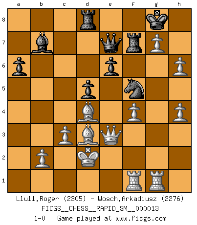 Last move : 1-0 2017 February 28 19:49:43 [Event "FICGS__CHESS__RAPID_SM__000013"] [Site "FICGS"] [Date "2016.09.29"] [Round "1"] [White "Llull,Roger"] [Black "Wosch,Arkadiusz"] [Result "1-0"] [WhiteElo "2305"] [BlackElo "2276"] 1.e4 c5 2.Nf3 Nc6 3.d4 cxd4 4.Nxd4 Nf6 5.Nc3 d6 6.Bg5 e6 7.Qd2 a6 8.Nxc6 bxc6 9.O-O-O h6 10.Bf4 d5 11.Qe3 Bb4 12.Be2 O-O 13.e5 Nd7 14.Qg3 Kh8 15.Qh3 Bxc3 16.Qxc3 Rb8 17.Qxc6 Qa5 18.Be3 Qxa2 19.Bd4 Qa1+ 20.Kd2 Qa5+ 21.Qc3 Qd8 22.Ra1 Bb7 23.Qe3 Rc8 24.g4 Kg8 25.h4 Qc7 26.c3 f6 27.f4 Nb8 28.exf6 Nc6 29.fxg7 Rf7 30.Raf1 Rd8 31.g5 Ne7 32.gxh6 Nf5 33.Bd3 Qe7 34.Rhg1 1-0 Comment by player 1 : Roger Llull : Thanks Thibault. This is probably a good opening for a thematic tournament, starting from the 9th move. Thibault de Vassal An impressive game... Herbert Kruse sure, Herbert Kruse this variation is lost Sicilian defense Queenside Castling by player White (move 9) Kingside Castling by player Black (move 12) Player White won this chess game. Follow this game move after move (download)A good sacrifice is one that is not necessarily sound but leaves your opponent dazed and confused. (Rudolph Spielmann) Wir irren allesamt, nur jeder irrt anders. (Georg Christoph Lichtenberg) Hay jugadores fuertes y personas amables y yo soy un jugador fuerte. (Bobby Fischer) Karpov est une pièce de musée. (Garry Kasparov) It is the aim of the modern school, not to treat every position according to one general law, but according to the principle inherent in the position. (Richard Reti)