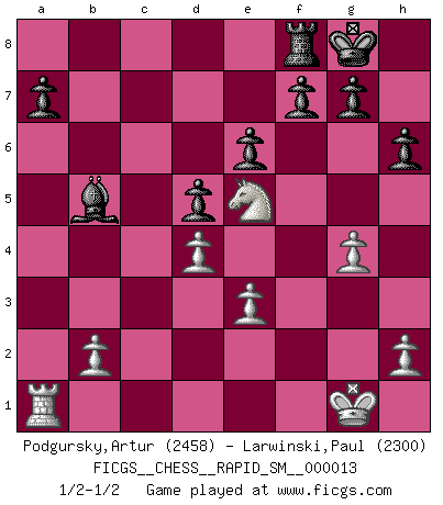Last move : 1/2-1/2 2016 October 9 23:0:40 [Event "FICGS__CHESS__RAPID_SM__000013"] [Site "FICGS"] [Date "2016.09.29"] [Round "1"] [White "Podgursky,Artur"] [Black "Larwinski,Paul"] [Result "1/2-1/2"] [WhiteElo "2458"] [BlackElo "2300"] 1.e4 e6 2.d4 d5 3.e5 c5 4.c3 Nc6 5.Nf3 Bd7 6.Be2 cxd4 7.cxd4 Nge7 8.Nc3 Nf5 9.O-O Rc8 10.Bg5 Qb6 11.Na4 Qa5 12.Rc1 h6 13.Be3 b5 14.Nc5 Bxc5 15.Rxc5 Qxa2 16.Qa1 Qxa1 17.Rxa1 Rb8 18.g4 Nxe3 19.fxe3 O-O 20.Bxb5 Rxb5 21.Rxb5 Nxe5 22.Nxe5 Bxb5 1/2-1/2 French : Advance, Euwe variation Kingside Castling by player White (move 9) Kingside Castling by player Black (move 19) This chess game ended in a draw. Follow this game move after move (download)Bobby Fischer is the greatest Chess genius of all time ! (Alexander Kotov) Ein Teil des Fehlers ist immer korrekt. (Savielly Grigorievitsch Tartakower) La vida es como el Ajedrez, con lucha, competición y eventos buenos y malos. (Benjamin Franklin) Les Echecs représentent une sphère d'idées créatrices basée sur la volonté des deux protagonistes. (Smyslov) Hold em is to stud what chess is to checkers. (Johnny Moss)