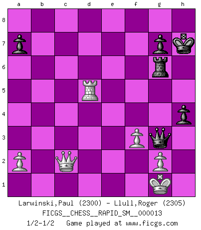 Last move : 1/2-1/2 2016 November 2 18:3:24 [Event "FICGS__CHESS__RAPID_SM__000013"] [Site "FICGS"] [Date "2016.09.29"] [Round "1"] [White "Larwinski,Paul"] [Black "Llull,Roger"] [Result "1/2-1/2"] [WhiteElo "2300"] [BlackElo "2305"] 1.d4 Nf6 2.c4 e6 3.Nc3 d5 4.cxd5 exd5 5.Bg5 c6 6.Qc2 Be6 7.e3 h6 8.Bh4 Nbd7 9.f3 Bd6 10.Bd3 c5 11.Nge2 c4 12.Bf5 O-O 13.O-O Qe8 14.Bxe6 fxe6 15.e4 dxe4 16.Nxe4 Nxe4 17.Qxe4 Nf6 18.Bxf6 Rxf6 19.Qxb7 Rb8 20.Qa6 Rxb2 21.Qxc4 Qh5 22.Ng3 Qg5 23.Qc8+ Kh7 24.Qc3 Rd2 25.Rfd1 Rxd1+ 26.Rxd1 Bxg3 27.hxg3 Qxg3 28.Qe3 Rg6 29.Qf2 Qd6 30.Qc2 h5 31.Qe4 Qg3 32.Qc2 h4 33.d5 exd5 34.Rxd5 Qe1+ 35.Kh2 Qg3+ 36.Kg1 Qe1+ 37.Kh2 Qg3+ 38.Kg1 1/2-1/2 Queen's pawn game Kingside Castling by player Black (move 12) Kingside Castling by player White (move 13) This chess game ended in a draw. Follow this game move after move (download)Nowadays, when you're not a grandmaster at 14, you can forget about it. (Anand Viswanathan) Man kann eine Schachpartie nur gewinnen, wenn das Gleichgewicht gestört ist. In einer Stellung mit ungestörtem Gleichgewicht ist auch das größte Genie hilflos - in der Stellung steckt dann eben kein genialer Einfall. (Wilhelm Steinitz) La batalla por la última verdad nunca sera ganada. Y es por eso que el Ajedrez es tan fascinante. (Hans Kmoch) Même un GMI sait rarement calculer sur plus de cinq coups une attaque à sacrifices. (Rudolf Spielmann) Luck is what you have left over after you give 100 percent. (Langston Coleman)