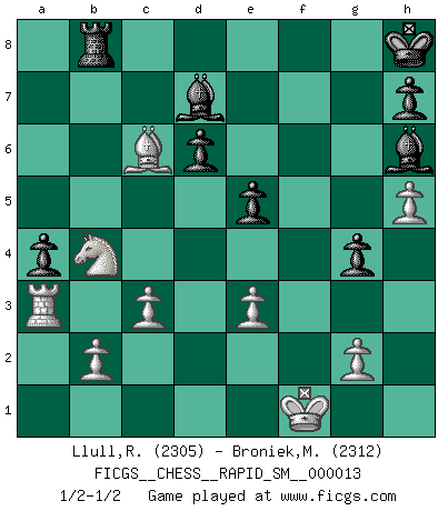 Last move : 1/2-1/2 2016 December 24 14:27:45 [Event "FICGS__CHESS__RAPID_SM__000013"] [Site "FICGS"] [Date "2016.09.29"] [Round "1"] [White "Llull,Roger"] [Black "Broniek,Mariusz Maciej"] [Result "1/2-1/2"] [WhiteElo "2305"] [BlackElo "2312"] 1.e4 c5 2.Nf3 Nc6 3.d4 cxd4 4.Nxd4 Nf6 5.Nc3 e5 6.Ndb5 d6 7.Bg5 a6 8.Na3 b5 9.Nd5 Be7 10.Bxf6 Bxf6 11.c3 Bg5 12.Nc2 Ne7 13.h4 Bh6 14.a4 bxa4 15.Bc4 O-O 16.Rxa4 a5 17.Nce3 Bd7 18.Nxe7+ Qxe7 19.Nd5 Qd8 20.Ra3 a4 21.Nb4 Qb6 22.O-O Kh8 23.Qe2 Rab8 24.Bd5 f5 25.exf5 Rxf5 26.Bf3 g6 27.Be4 Rf7 28.h5 g5 29.Qe3 Qxe3 30.fxe3 Rxf1+ 31.Kxf1 g4 32.Bc6 1/2-1/2 Sicilian : Pelikan (Lasker/Sveshnikov) variation Kingside Castling by player Black (move 15) Kingside Castling by player White (move 22) This chess game ended in a draw. Follow this game move after move (download)We don't really know how the game was invented, though there are suspicions. As soon as we discover the culprits, we'll let you know. (Bruce Pandolfini) Bobby Fischer ist kein Vorbild für die heutige Jugend. (Viktor Kortschnoi) El Ajedrez demanda una total concentración. (Bobby Fischer) Dans le domaine de la peinture, de la gravure et de la sculpture, dès la première décennie de notre siècle, les artistes abandonnent la représentation de la partie d'échecs pour se concentrer sur les pièces, sur les échiquiers et sur toutes les variations auxquelles les unes et les autres peuvent donner lieu. On passe en quelque sorte d'un thème social à un thème musical (au sens de la musica médiévale, c'est-à-dire d'une notion qui inclue le rythme, l'harmonie, la construction et la déconstruction, etc.). Graphiquement et picturalement, l'échiquier apparaît comme une structure ouverte, dynamique, d'une richesse infinie, autorisant toutes les combinatoires et débouchant sur des mouvements et des rythmes de nature exponentielle. (Michel Pastoureau) The hypothalamus is one of the most important parts of the brain, involved in many kinds of motivation, among other functions. The hypothalamus controls the 'Four Fs: Fighting, Fleeing, Feeding and Mating. (Unknown author)