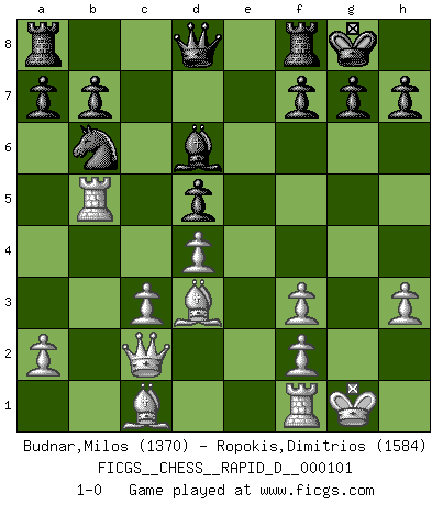 Last move : 1-0 2017 January 15 0:7:53 [Event "FICGS__CHESS__RAPID_D__000101"] [Site "FICGS"] [Date "2016.09.30"] [Round "1"] [White "Budnar,Milos"] [Black "Ropokis,Dimitrios"] [Result "1-0"] [WhiteElo "1370"] [BlackElo "1584"] 1.e4 e5 2.Nf3 Nf6 3.Nxe5 d6 4.Nf3 Nxe4 5.d4 d5 6.Bd3 Bd6 7.O-O O-O 8.c4 c6 9.cxd5 cxd5 10.Nc3 Nxc3 11.bxc3 Bg4 12.Rb1 Nd7 13.h3 Bh5 14.Rb5 Nb6 15.Qc2 Bxf3 16.gxf3 1-0 This chess game has been lost on time (started : 2016.09.30 16:7:17) Petrov : Classical attack, Marshall variation Kingside Castling by player White (move 7) Kingside Castling by player Black (move 7) Player White won this chess game. Follow this game move after move (download)All I want to do, ever, is just play Chess. (Bobby Fischer) Ich trinke, ich rauche, ich spiele, ich liebe Frauen aber Fernschach ist ein Laster, das ich nicht habe. (Mikhail Nekhemyevich Tal) ¿Quién es tu oponente esta tarde? Esta tarde mi oponente son las piezas negras. (Akiba Rubinstein) En blitz, le Cavalier l'emporte sur le Fou. (Vlastimil Hort) Pushing plastic is for the many, pushing virtual pieces is for the fewer, pushing wood is for the very few. (Normajean Yates)