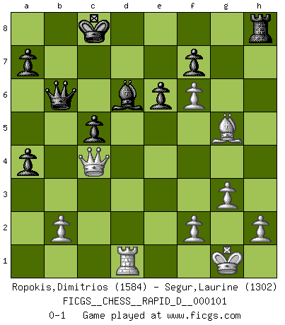 Last move : 0-1 2017 February 2 13:42:3 [Event "FICGS__CHESS__RAPID_D__000101"] [Site "FICGS"] [Date "2016.09.30"] [Round "1"] [White "Ropokis,Dimitrios"] [Black "Segur,Laurine"] [Result "0-1"] [WhiteElo "1584"] [BlackElo "1302"] 1.d4 d5 2.c4 e6 3.Nc3 Nf6 4.Nf3 c6 5.Bg5 dxc4 6.e4 b5 7.e5 h6 8.Bh4 g5 9.Nxg5 hxg5 10.Bxg5 Nbd7 11.g3 Bb7 12.exf6 c5 13.d5 Qa5 14.Bg2 Nb6 15.O-O O-O-O 16.Qg4 Nxd5 17.Nxd5 Bxd5 18.Bxd5 Rxd5 19.Rfd1 Rxd1+ 20.Rxd1 Qb6 21.a4 bxa4 22.Qxc4 Bd6 0-1 This chess game has been lost on time (started : 2016.09.30 16:7:17) QGD Semi-Slav : Botvinnik system (anti-Meran) Kingside Castling by player White (move 15) Queenside Castling by player Black (move 15) Player Black won this chess game. Follow this game move after move (download)First-class players lose to second-class players because second-class players sometimes play a first-class game. (Siegbert Tarrasch) Die Fehler sind da, Sie warten nur darauf gemacht zu werden. (Savielly Grigorievitsch Tartakower) La vida es como un juego de Ajedrez, cambiando con cada movimiento. (Proverbio Chino) Je ne suis pas le dernier à jouer lâchement des coups douteux pendant le zeïtnot de l'adversaire pour l'achever: en effet les coups qui font le plus peur sont ceux que l'on ne comprend pas. Je me fais souvent peur quand je joue. (Un professeur anonyme) I don't believe in psychology. I believe in good moves. (Bobby Fischer)
