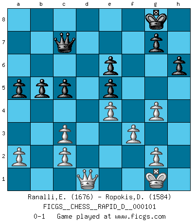 Last move : 0-1 2017 January 3 10:14:23 [Event "FICGS__CHESS__RAPID_D__000101"] [Site "FICGS"] [Date "2016.09.30"] [Round "1"] [White "Ranalli,Emmanuel Eduardo"] [Black "Ropokis,Dimitrios"] [Result "0-1"] [WhiteElo "1676"] [BlackElo "1584"] 1.e4 e5 2.Nf3 Nf6 3.Nc3 Nc6 4.Bc4 Bb4 5.d3 d6 6.O-O O-O 7.Bg5 Bxc3 8.bxc3 Be6 9.Bxe6 fxe6 10.d4 Qe8 11.Qd3 h6 12.Bh4 Nh5 13.Bg3 Nxg3 14.hxg3 b6 15.dxe5 Nxe5 16.Nxe5 dxe5 17.Qc4 c5 18.Rad1 Qc6 19.f3 Rad8 20.g4 b5 21.Qe2 a5 22.Rxd8 Rxd8 23.Rd1 Rxd1+ 24.Qxd1 Qc7 0-1 This chess game has been lost on time (started : 2016.09.30 16:7:17) Petrov Three knights game Kingside Castling by player White (move 6) Kingside Castling by player Black (move 6) Player Black won this chess game. Follow this game move after move (download)In Chess, as it is played by masters, chance is practically eliminated. (Emanuel Lasker) Aljechin war kein Nazi. Er war ein Opportunist. Ein schrecklicher Mann. Er liebte Geld über alles und würde für Geld ein Jude, ein Katolik oder ein Protestant werden. (Miguel Najdorf) Nada excita más a Grandes Maestros aburridos que una novedad teórica. (Dominic Lawson) Le succès, c'est être capable d'aller d'échec en échec sans perdre son enthousiasme. (Winston Churchill) Wisdom begins at the end. (Daniel Webster)