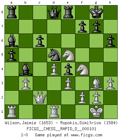Last move : 1-0 2017 January 7 10:56:21 [Event "FICGS__CHESS__RAPID_D__000101"] [Site "FICGS"] [Date "2016.09.30"] [Round "1"] [White "Wilson,Jaimie"] [Black "Ropokis,Dimitrios"] [Result "1-0"] [WhiteElo "1653"] [BlackElo "1584"] 1.d4 d5 2.c4 e6 3.Nc3 Nf6 4.cxd5 exd5 5.Bg5 c6 6.e3 h6 7.Bh4 Be7 8.Bd3 O-O 9.Qc2 b5 10.a3 a5 11.Nf3 Nbd7 12.O-O Bb7 13.Rfd1 b4 14.Ne2 Re8 15.h3 Qb6 16.axb4 Bxb4 17.Bg3 Ne4 18.Bxe4 dxe4 19.Nd2 Ba6 20.Nc4 Qd8 21.b3 Nb6 22.Nf4 Nd5 23.Ne5 1-0 This chess game has been lost on time (started : 2016.09.30 16:7:17) QGD : Exchange, positional line, 5...c6 Kingside Castling by player Black (move 8) Kingside Castling by player White (move 12) Player White won this chess game. Follow this game move after move (download)Blessed be the memory of him who gave the world this immortal game. (A. G. Gardiner) Ich verstehe den Grund nicht, warum die Aufteilung in Frauen und Männer überhaupt im Schach besteht. (Judith Polgar) El Ajedrez es una guerra en un tablero. El objetivo es aplastar la mente del oponente. (Bobby Fischer) Mon pion favori sur ma case favorite ! Bronstein en parlant d'un coup de pion en h5 quand il avait les Noirs. May the force be with you. (Han Solo in Star Wars ep.4)