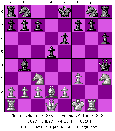Last move : 0-1 2016 December 18 20:56:31 [Event "FICGS__CHESS__RAPID_D__000101"] [Site "FICGS"] [Date "2016.09.30"] [Round "1"] [White "Nezumi,Mashi"] [Black "Budnar,Milos"] [Result "0-1"] [WhiteElo "1335"] [BlackElo "1370"] 1.g4 d5 2.d4 Bxg4 3.f3 Bf5 4.Nc3 e6 5.h4 Bb4 6.Bd2 h6 7.Bh3 Bxh3 8.Nxh3 Qxh4+ 9.Kf1 Qxd4 10.Rg1 Qh4 0-1 This chess game has been lost on time (started : 2016.09.30 16:7:17) Grob's attack Player Black won this chess game. Follow this game move after move (download)Fischer sacrificed virtually everything most of us weakies (to use his term) value, respect, and cherish, for the sake of an artful, often beautiful board game, for the ambivalent privilege of being its greatest master. (Paul Kollar) Ich las kürzlich ein Buch von Nietzsche. Er sagte Religion verdumme nur die Menschen. Ich stimme zu. (Robert James Fischer) El Ajedrez es la vida. (Bobby Fischer) J'apprécie les joueurs d'est-indienne, c'est grâce à eux que je nourris ma famille depuis tant d'années. (Petrosian) Men never do evil so completely and cheerfully as when they do it from religious conviction. (Blaise Pascal)