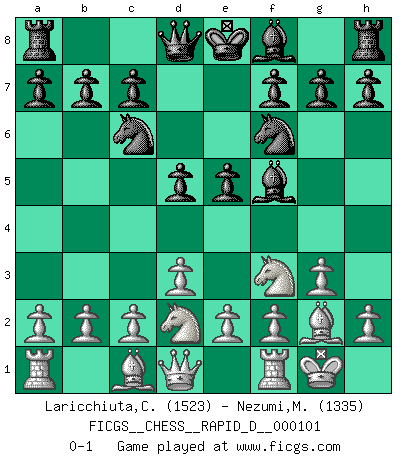 Last move : 0-1 2016 November 29 6:49:44 [Event "FICGS__CHESS__RAPID_D__000101"] [Site "FICGS"] [Date "2016.09.30"] [Round "1"] [White "Laricchiuta,Claudio"] [Black "Nezumi,Mashi"] [Result "0-1"] [WhiteElo "1523"] [BlackElo "1335"] 1.Nf3 d6 2.g3 Nc6 3.Bg2 Bf5 4.d3 e5 5.Nbd2 Nf6 6.O-O d5 0-1 This chess game has been lost on time (started : 2016.09.30 16:7:17) Reti Opening Kingside Castling by player White (move 6) Player Black won this chess game. Follow this game move after move (download)For surely of all the drugs in the world, Chess must be the most permanently pleasurable. (Assiac) Zu meiner Zeit war ein 20 jähriger ein junger Spieler, heute ist er ein Veteran. (Garry Kasparov) Solo puedes ser bueno en el Ajedrez si amas al juego. (Bobby Fischer) Le thème de l'attaque double intervient d'une manière ou d'une autre dans l'immense majorité des combinaisons. (Youri Averbakh) The real danger is not that computers will begin to think like men, but that men will begin to think like computers. (Sydney J. Harris)