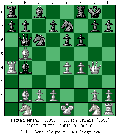 Last move : 0-1 2016 December 7 19:58:23 [Event "FICGS__CHESS__RAPID_D__000101"] [Site "FICGS"] [Date "2016.09.30"] [Round "1"] [White "Nezumi,Mashi"] [Black "Wilson,Jaimie"] [Result "0-1"] [WhiteElo "1335"] [BlackElo "1653"] 1.e4 c5 2.a3 e6 3.b4 cxb4 4.axb4 Bxb4 5.Ra4 Nc6 6.Bb5 Nge7 7.Bb2 O-O 8.Qg4 f6 9.f4 Qb6 0-1 This chess game has been lost on time (started : 2016.09.30 16:7:17) Sicilian defense Kingside Castling by player Black (move 7) Player Black won this chess game. Follow this game move after move (download)It began to feel as though you were playing against Chess itself. - On playing against Robert Fischer. (Walter Shipman) Nach Morphy wurde nichts neues mehr in der Behandlung offener Positionen gefunden. (Mikhail Moiseyevich Botvinik) Las combinaciones han sido siempre el aspecto más intrigante del Ajedrez. Los Maestros las buscan, el público las aplauden, los críticos las alaban. La razón se debe a que las combinaciones hacen posible que el Ajedrez sea más que un ejercicio matemático con una carencia de vida. Ellas son la poesía del juego, son del Ajedrez lo que la melodía es de la música. Ellas representan el triunfo de la mente sobre la materia. (Reuben Fine) Il s'avisa de me proposer d'apprendre les échecs qu'il jouait un peu... me voilà forcené des échecs. J'achète un échiquier, je m'enferme dans ma chambre, j'y passe des jours et des nuits à vouloir apprendre par cur toutes les parties. (Jean-Jacques Rousseau, Confessions) Now you put water in a cup, it becomes the cup; You put water into a bottle it becomes the bottle; You put it in a teapot it becomes the teapot. Water can flow or it can crash. Be water, my friend. (Bruce Lee)