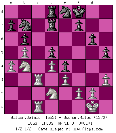 Last move : 1/2-1/2 2017 January 20 16:28:22 [Event "FICGS__CHESS__RAPID_D__000101"] [Site "FICGS"] [Date "2016.09.30"] [Round "1"] [White "Wilson,Jaimie"] [Black "Budnar,Milos"] [Result "1/2-1/2"] [WhiteElo "1653"] [BlackElo "1370"] 1.d4 d5 2.c4 e6 3.Nc3 c6 4.Nf3 Nf6 5.e3 Nbd7 6.Qc2 b6 7.cxd5 cxd5 8.Nb5 Bb4+ 9.Bd2 Bxd2 10.Nxd2 O-O 11.Bd3 g6 12.Rc1 e5 13.Qc7 Qxc7 14.Nxc7 Rb8 15.O-O e4 16.Bb5 Bb7 17.Rc3 Rfd8 18.Rfc1 Kf8 19.h3 h5 20.b4 Ne8 21.a4 Nd6 22.Ba6 Nf6 23.Bxb7 Rxb7 24.b5 Nfe8 25.Na6 Rbd7 26.Nb4 Nb7 1/2-1/2 QGD : Semi-Slav Kingside Castling by player Black (move 10) Kingside Castling by player White (move 15) This chess game ended in a draw. Follow this game move after move (download)Botvinnik tried to take the mystery out of Chess, always relating it to situations in ordinary life. He used to call Chess a typical inexact problem similar to those which people are always having to solve in everyday life. (Garry Kasparov) Ich könnte leicht behaupten: Ja,ja, Leonid Breschnew wollte nicht, daß ich Weltmeister werde. In der Tat war die Sache komplizierter. (Viktor Kortschnoi) Siempre es mucho mejor sacrificar las piezas de tu oponente. (Savielly Tartakover) Pour moi, les échecs ne sont pas un jeu mais un art. (Alexandre Alekhine) Everybody lies. (Gregory House, House M.D.)