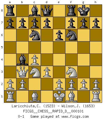 Last move : 0-1 2016 November 23 6:16:59 [Event "FICGS__CHESS__RAPID_D__000101"] [Site "FICGS"] [Date "2016.09.30"] [Round "1"] [White "Laricchiuta,Claudio"] [Black "Wilson,Jaimie"] [Result "0-1"] [WhiteElo "1523"] [BlackElo "1653"] 1.Nf3 Nf6 2.c4 e6 3.Nc3 Bb4 4.Qb3 Nc6 5.d3 O-O 0-1 This chess game has been lost on time (started : 2016.09.30 16:7:17) Reti Opening Kingside Castling by player Black (move 5) Player Black won this chess game. Follow this game move after move (download)Fischer, who may or may not be mad as a hatter, has every right to be horrified. (Jeremy Silman) Darum geht es im Schach. Einen Tag gibst du deinem Gegner eine Lektion, am nächsten Tag gibt er dir eine. (Robert James Fischer) El Ajedrez es una guerra en un tablero. El objetivo es aplastar la mente del oponente. (Bobby Fischer) Nous sommes les pions de la mystérieuse partie d'Echecs jouée par Dieu. Il nous déplace, nous arrête, nous pousse encore, puis nous lance un à un dans la boîte du Néant. Epitaphe sur la tombe de David Janowsky (1868-1927). But they are useless. They can only give you answers. (Pablo Picasso, about computers)