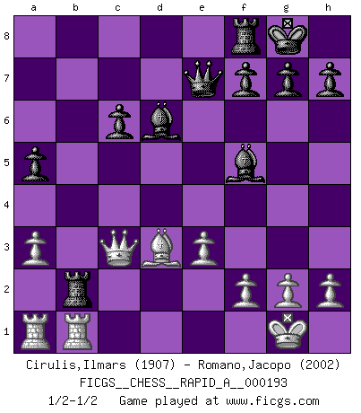 Last move : 1/2-1/2 2016 November 7 17:8:20 [Event "FICGS__CHESS__RAPID_A__000193"] [Site "FICGS"] [Date "2016.10.01"] [Round "1"] [White "Cirulis,Ilmars"] [Black "Romano,Jacopo"] [Result "1/2-1/2"] [WhiteElo "1907"] [BlackElo "2002"] 1.b4 e5 2.a3 d5 3.Bb2 Bd6 4.Nf3 Qe7 5.c4 dxc4 6.e3 Nf6 7.Bxc4 c6 8.Nc3 O-O 9.Qc2 Nbd7 10.Ng5 a5 11.b5 Nc5 12.bxc6 bxc6 13.O-O Rb8 14.d3 Bf5 15.Rfb1 e4 16.Ngxe4 Nfxe4 17.dxe4 Nxe4 18.Bd3 Nxc3 19.Qxc3 Rxb2 1/2-1/2 Polish (Sokolsky) opening Kingside Castling by player Black (move 8) Kingside Castling by player White (move 13) This chess game ended in a draw. Follow this game move after move (download)Chess is as much a mystery as women. (Purdy) Wie ich sie so einen nach dem anderen nieder mähte wurde meine Überlegenheit offensichtlich. (José Raúl Capablanca) El juego de Damas es para vagabundos. (Paul Morphy) Je crois qu'il existe des manières très spécifiques de jouer efficacement contre une machine. Evidemment, nous n'avons aucune chance en technique pure, parce que l'ordinateur calcule de manière parfaite. Mais lorsque nous faisons appel à notre cerveau, en utilisant l'intuition et la compréhension, alors nous restons beaucoup plus forts. (Anatoli Karpov) A clear conscience is usually the sign of a bad memory. (Unknown)