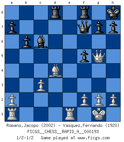 Last move : 1/2-1/2 2017 February 18 18:40:11 [Event "FICGS__CHESS__RAPID_A__000193"] [Site "FICGS"] [Date "2016.10.01"] [Round "1"] [White "Romano,Jacopo"] [Black "Vasquez,Fernando"] [Result "1/2-1/2"] [WhiteElo "2002"] [BlackElo "1920"] 1.e4 e5 2.Nf3 Nf6 3.Nxe5 d6 4.Nf3 Nxe4 5.d4 d5 6.Bd3 Nc6 7.O-O Be7 8.c4 Nb4 9.Be2 O-O 10.Nc3 Be6 11.Ne5 f6 12.Nf3 Kh8 13.Qb3 Qd7 14.cxd5 Nxc3 15.bxc3 Bxd5 16.Qb2 Nc6 17.Be3 Na5 18.Nd2 b6 19.Rfe1 Rad8 20.Qc2 f5 21.Nf3 Be4 22.Qc1 Bd6 23.Bf4 c5 24.Ne5 Bxe5 25.Bxe5 Nc6 26.Bb5 cxd4 27.Qg5 Qf7 28.Bxc6 Bxc6 29.Bxd4 1/2-1/2 Petrov : Classical attack Kingside Castling by player White (move 7) Kingside Castling by player Black (move 9) This chess game ended in a draw. Follow this game move after move (download)Chess is no whit inferior to the violin, and we have a large number of professional violinists. (Mikhail Botvinnik) Im Schach nämlich geht es darum, daß Ich des Gegners klein zu kriegen, sein Ego zu zerbrechen und zu zermahlen, seine Selbstachtung zu zertreten und zu verscharren und seine ganze mißachtenswerte sogenannte Persönlichkeit ein für alle Mal tot zu hacken und zu zerstampfen und dadurch die menschliche Gesellschaft von einer stinkenden Pestbeule zu befreien. Es ist ein königliches Spiel. (Robert James Fischer) Siempre es mucho mejor sacrificar las piezas de tu oponente. (Savielly Tartakover) Votre seul travail dans les ouvertures est d'obtenir un milieu de partie jouable. (Lajos Portish) Imagination is more important than knowledge. Knowledge is limited. Imagination encircles the world. (Albert Einstein)