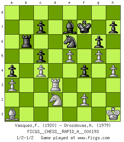 Last move : 1/2-1/2 2017 January 15 12:30:27 [Event "FICGS__CHESS__RAPID_A__000193"] [Site "FICGS"] [Date "2016.10.01"] [Round "1"] [White "Vasquez,Fernando"] [Black "Drozdovas,Arturas"] [Result "1/2-1/2"] [WhiteElo "1920"] [BlackElo "1979"] 1.e4 e5 2.Nf3 Nc6 3.d4 exd4 4.Nxd4 Nf6 5.Nxc6 bxc6 6.e5 Qe7 7.Qe2 Nd5 8.c4 Ba6 9.b3 g6 10.Bb2 Bg7 11.Nd2 Nb4 12.Nf3 c5 13.g3 O-O 14.Bg2 d5 15.O-O Rad8 16.a3 Nc6 17.Rfe1 dxc4 18.bxc4 Nd4 19.Qe4 f5 20.Qd3 Ne6 21.Qc2 Bb7 22.Rad1 f4 23.g4 Rxd1 24.Rxd1 Bc6 25.Qe2 Rb8 26.Rd3 a5 27.h3 a4 28.Kh2 Bh6 29.Ba1 Rb6 30.Qd1 Qf8 31.Bh1 Qa8 32.h4 Bf8 33.Nd2 Bxh1 34.Qxh1 Qxh1+ 35.Kxh1 Be7 36.g5 Kf7 1/2-1/2 Scotch : Mieses variation Kingside Castling by player Black (move 13) Kingside Castling by player White (move 15) This chess game ended in a draw. Follow this game move after move (download)A big shock; the best chess player in history has passed away. (Lajos Portisch, about Bobby Fischer's death) Karpov ist ein Museumsstück. (Garry Kasparov) Cada Peón es potencialmente una Reina. (James Mason) La tactique, c'est ce que vous faites quand il y a quelque chose à faire; la stratégie, c'est ce que vous faites quand il n'y a rien à faire. (Savielli Tartacower) The smarter you play, the luckier you'll be. (Mark Pilarski)