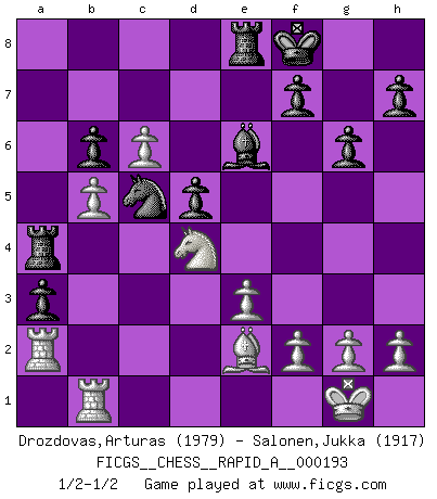 Last move : 1/2-1/2 2016 October 27 8:29:22 [Event "FICGS__CHESS__RAPID_A__000193"] [Site "FICGS"] [Date "2016.10.01"] [Round "1"] [White "Drozdovas,Arturas"] [Black "Salonen,Jukka"] [Result "1/2-1/2"] [WhiteElo "1979"] [BlackElo "1917"] 1.d4 d5 2.c4 e6 3.Nc3 Nf6 4.cxd5 exd5 5.Bg5 Be7 6.e3 c6 7.Bd3 Nbd7 8.Nf3 O-O 9.Qc2 Re8 10.O-O g6 11.Rac1 Ne4 12.Bxe7 Qxe7 13.b4 a6 14.a4 Ndf6 15.b5 cxb5 16.axb5 Nxc3 17.Qxc3 a5 18.Qc5 Be6 19.Ng5 a4 20.Rc2 Qxc5 21.dxc5 Nd7 22.Nf3 b6 23.c6 Nc5 24.Be2 a3 25.Nd4 Kf8 26.Ra2 Ra4 27.Rb1 1/2-1/2 QGD : Exchange, positional line Kingside Castling by player Black (move 8) Kingside Castling by player White (move 10) This chess game ended in a draw. Follow this game move after move (download)When you don't know what to play, wait for an idea to come into your opponent's mind. You may be sure that idea will be wrong. (Siegbert Tarrasch) Der Verteidiger gebe der Gewalt nach, aber nur der Gewalt. Er schaffe sich nicht freiwillig, etwa aus Blindheit oder aus Schrecken, irgendwelche Schwächen. Er lasse sich nicht bluffen. (Emanuel Lasker) Hasta este punto, las blancas han seguido un análisis bien conocido. Pero ahora el hace un error fatal: empieza a usar su propia cabeza. (Siegbert Tarrasch) Pour moi, les échecs ne sont pas un jeu mais un art. (Alexandre Alekhine) I teach you to lie, cheat and steal, and as soon as my back's turned you wait in line ? (Gregory House, House M.D.)